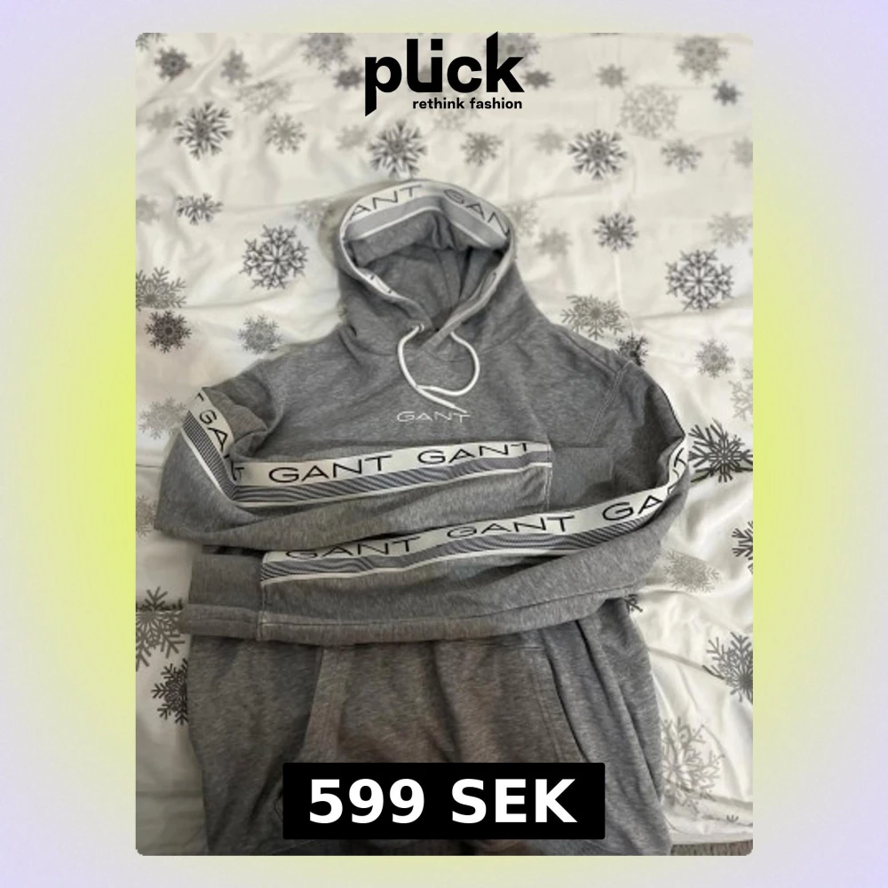 Säljer en grå hoodie från GANT med vit logoband längs ärmarna och huvan. Tröjan har huva med snörning och ribbade muddar. GANT-logga broderad på bröstet. Perfekt för chill dagar och streetstyle.