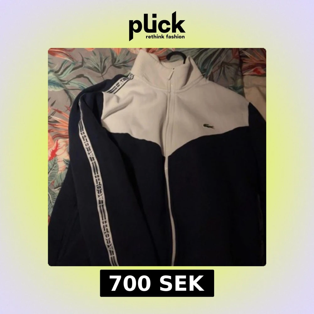 Snygg blå och vit vindjacka från Lacoste med dragkedja framtill och hög krage. Jackan har vita detaljer längs axlarna och ärmarna med Lacoste-tryck. Perfekt för en sportig och stilren look.