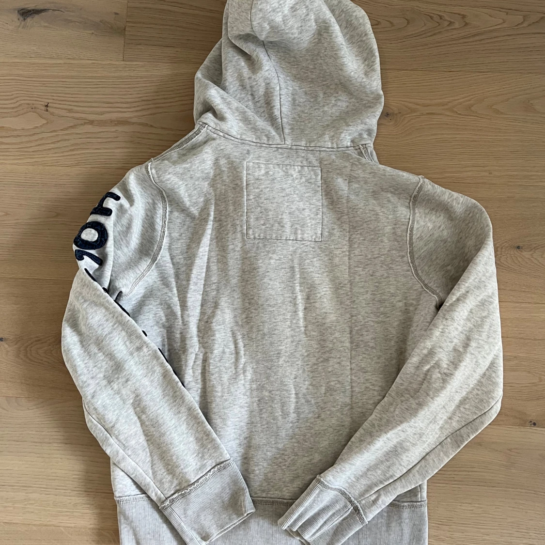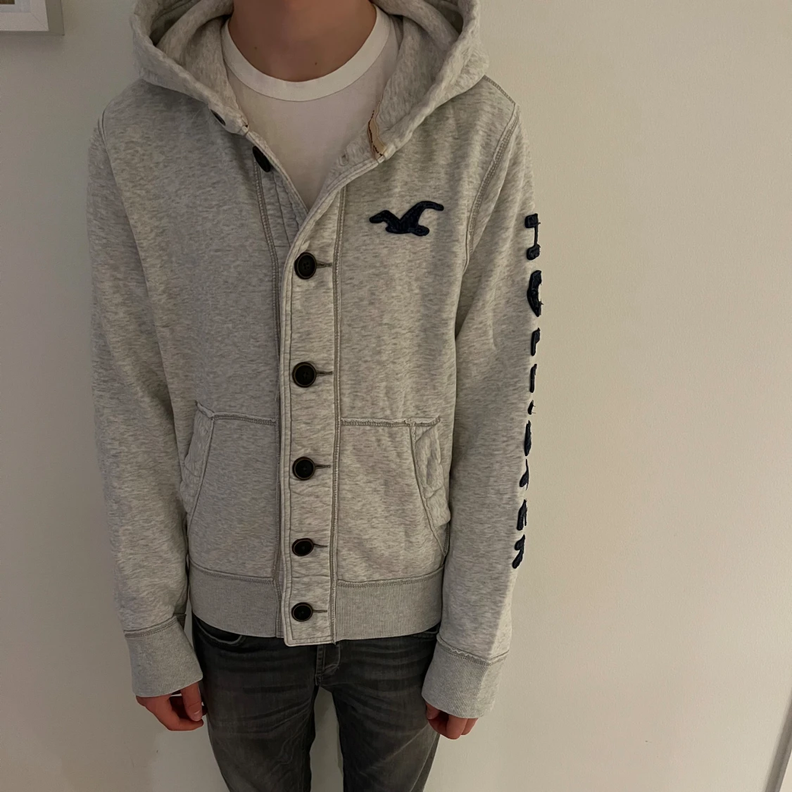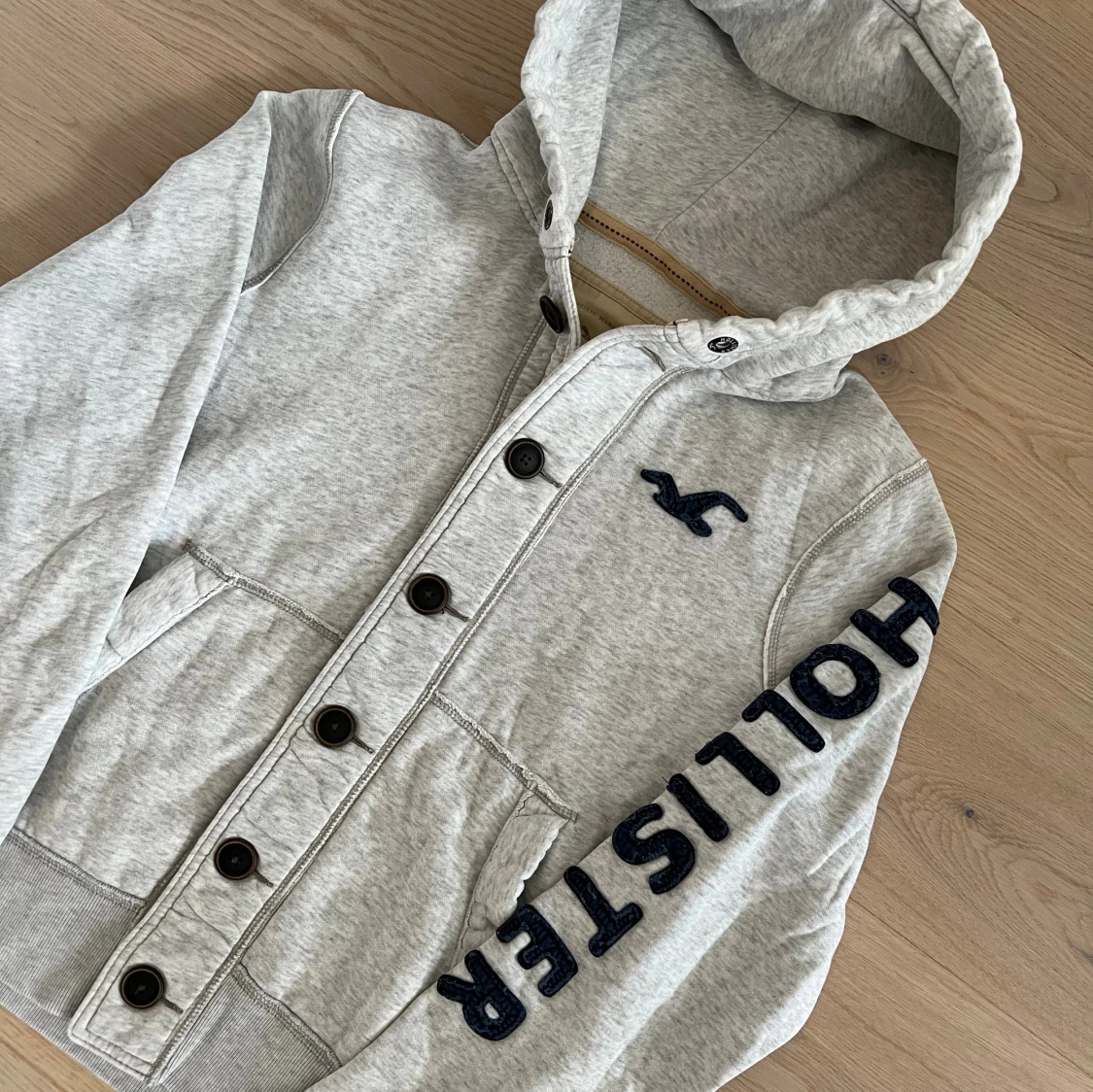 Säljer nu denna sjukt snygga hoodien från Hollister. OBS Storlek L men sitter mer som M, se mått. Bra skick, förutom en liten fläck på insidan av luvan, se bild 4. Inget man stör sig på då den knappt syns vid användning. Längd: 63, bredd: 54, arm: 66. Modellen är 183, 67kg. Skriv vid frågor.
