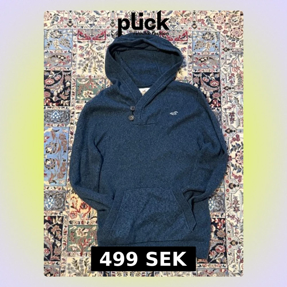 Supermysig och bekväm hoodie från Hollister i mörkblå melerad färg. Mjukt material, skön huva och knappar vid halsen som ger ett stilrent uttryck. Perfekt för vintern och även en riktigt bra present. Passform: Storlek S, passar mig som är 176 cm, väger 73 kg och brukar ha S. Passar även M om man vill att den ska sitta lite slim. Skick: 9/10 Otroligt fint skick utan defekter eller slitage. Hör av er vid frågor – jag kan skicka fler bilder