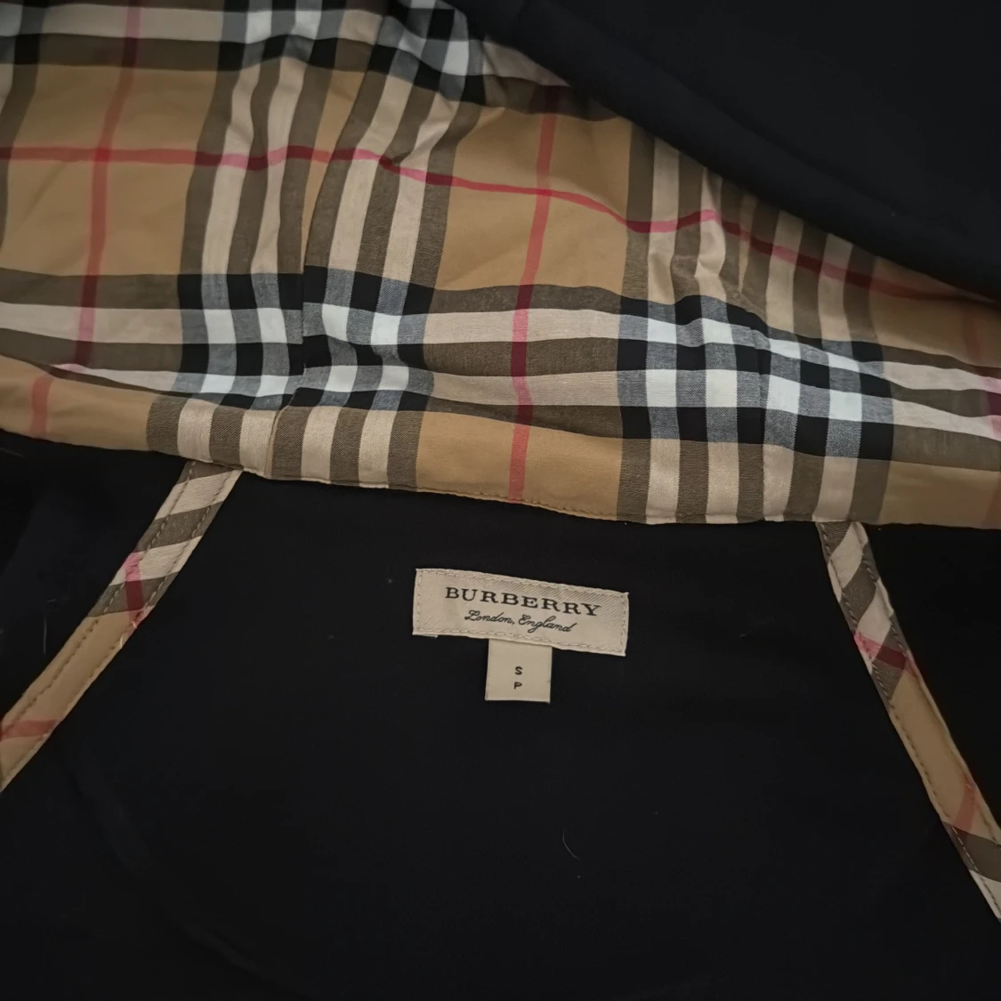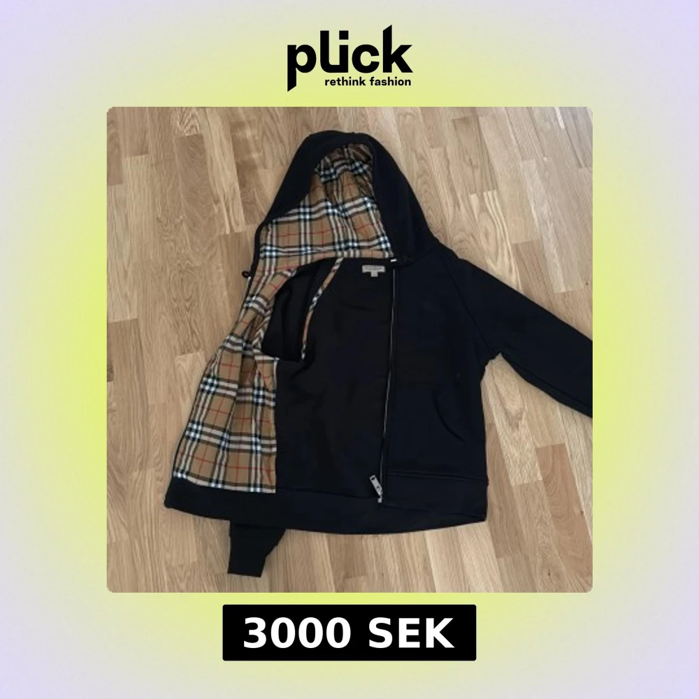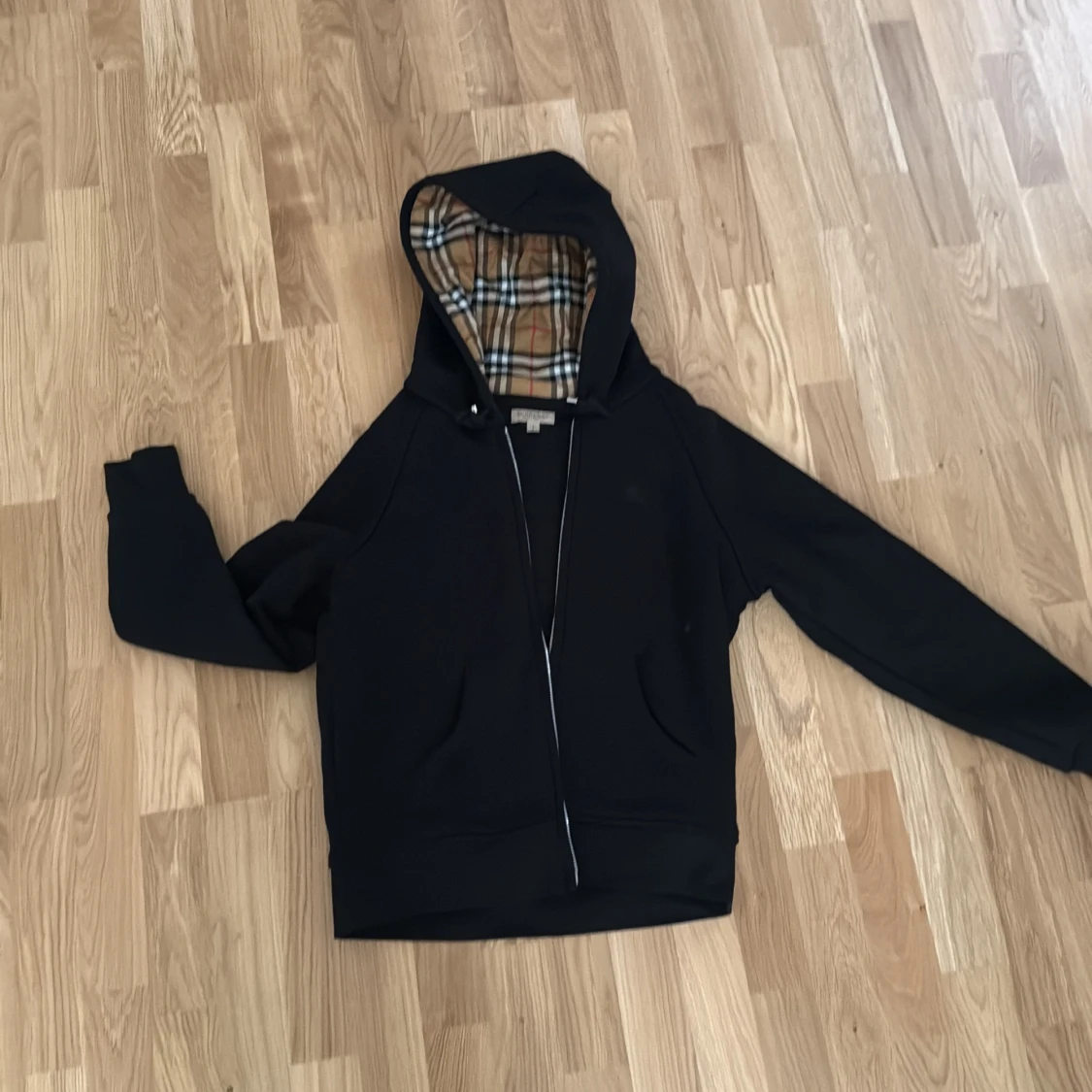 Svart hoodie från Burberry med rutig beige insida och huva, dragkedja framtill, två fickor och ribbade muddar. Två fläckar som inte syns om man inte vet om dem, se sista bilderna annars som ny, använd 2-3 gånger.