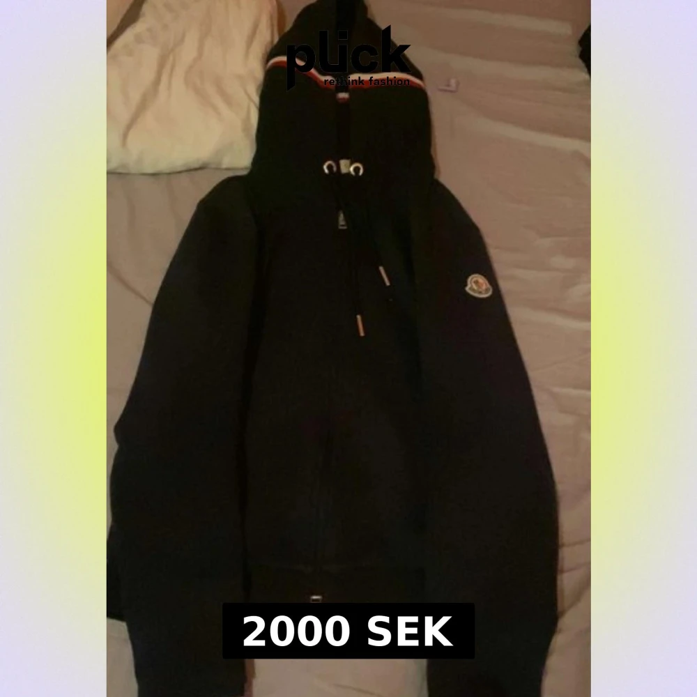 Säljer en svart hoodie från Moncler med dragkedja och huva. Jackan har vita och röda ränder på huvan och ärmsluten samt Moncler-logga på ärmen. Tillverkad i mjuk bomull och har snörning i huvan. Perfekt för dig som vill ha en clean och stilren look.