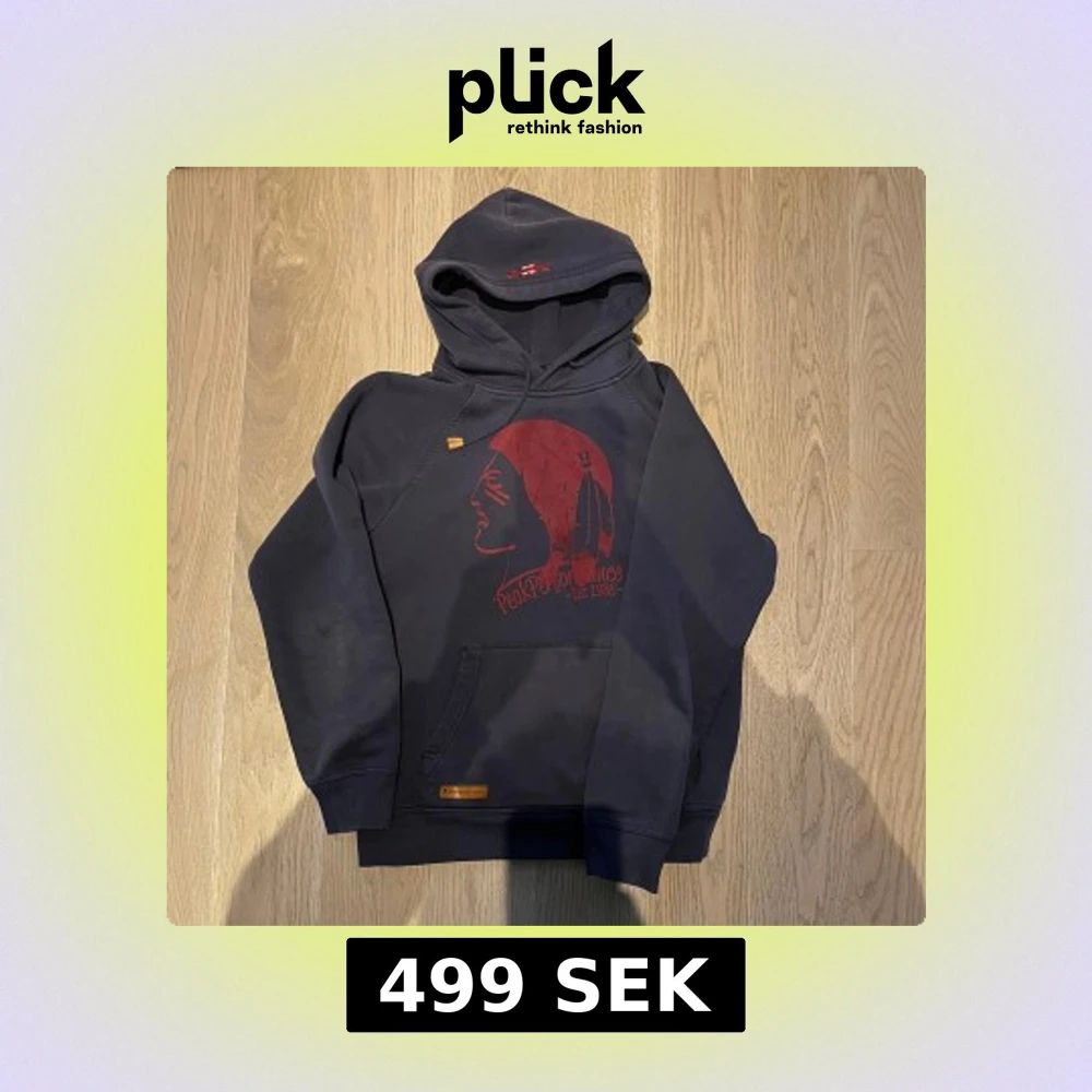 Snygg mörkblå hoodie från Peak Performance med röd tryckt grafik framtill och broderad detalj på huvan. Klassisk känguruficka, dragsko i huvan och mjukt bomullsmaterial.