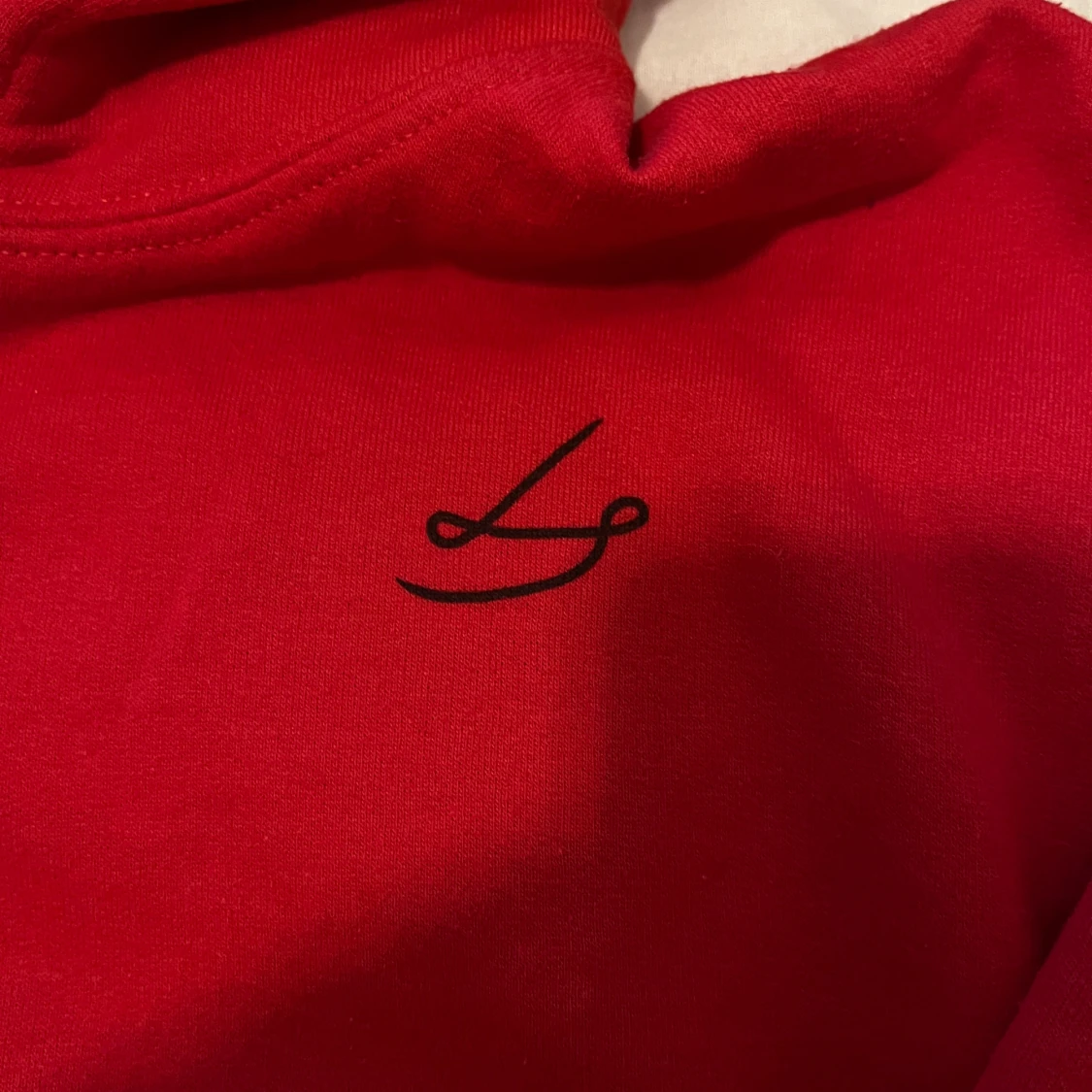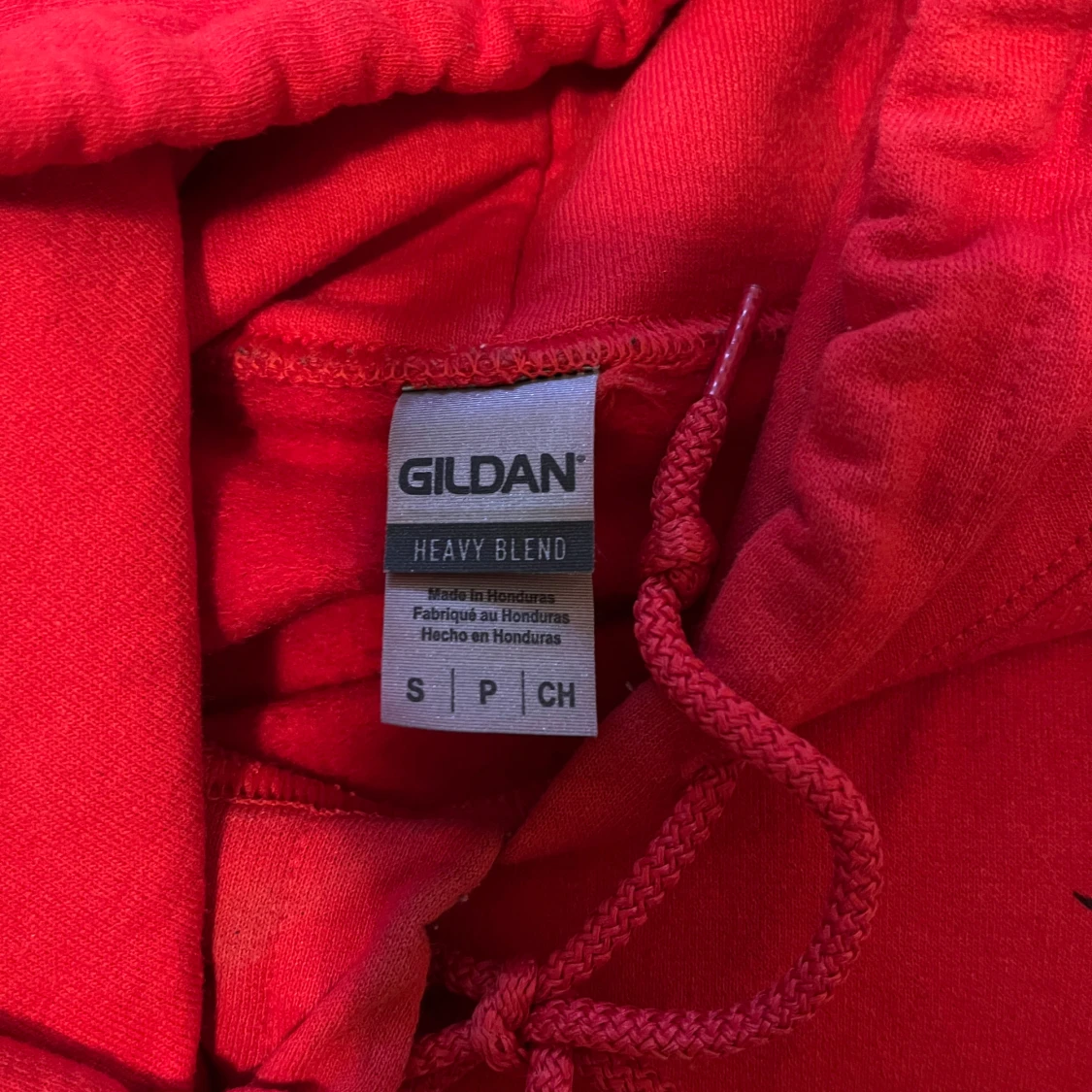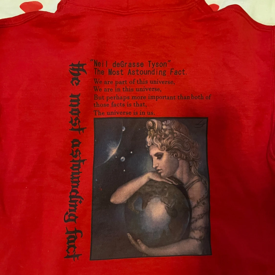 Röd hoodie från Gildan med snörning i huvan och svart broderad logga på bröstet. Baksidan har ett stort tryck med konstmotiv och citat av Neil deGrasse Tyson. Tillverkad i en mjuk bomullsblandning, perfekt för dig som gillar unika detaljer och statement-plagg.