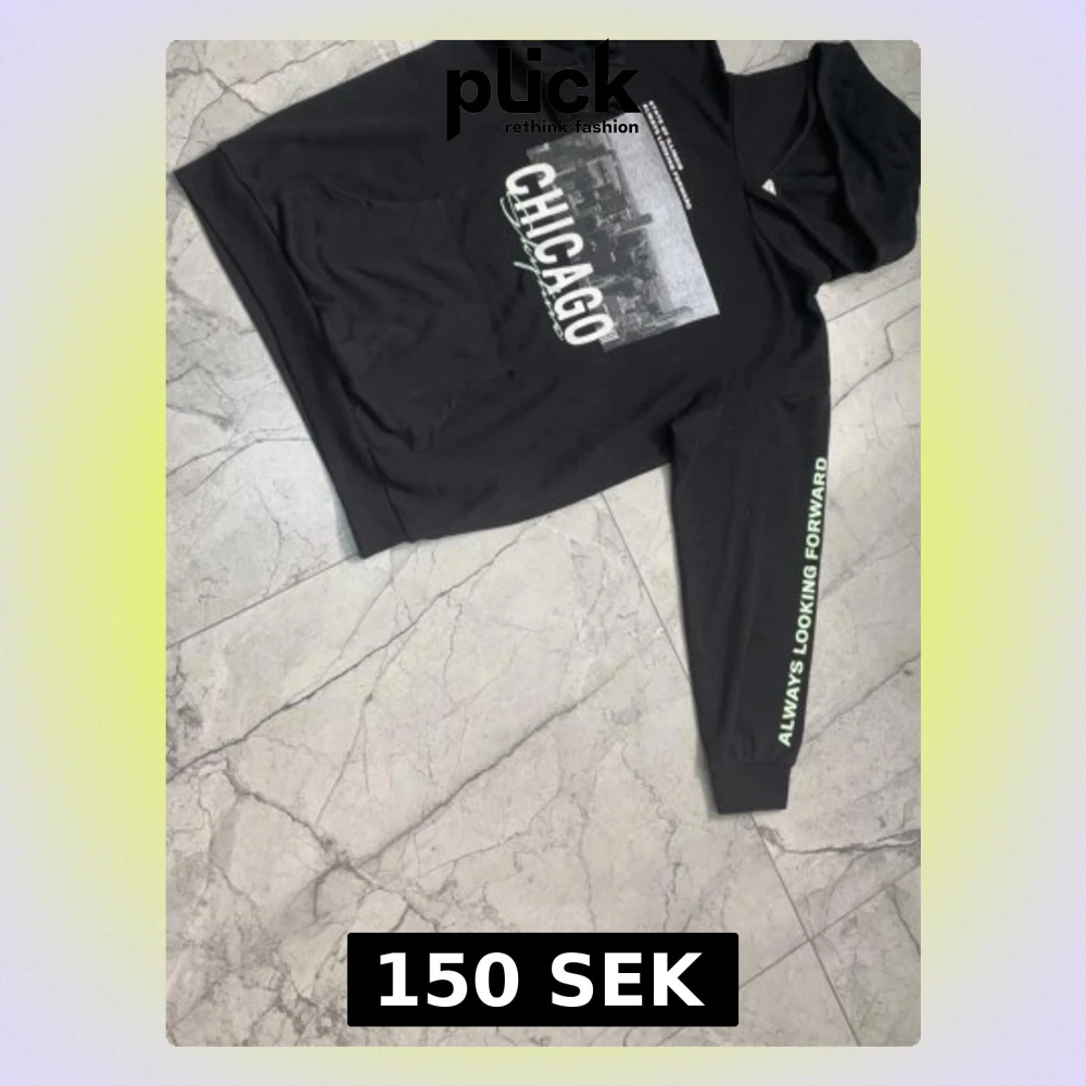 Cool svart hoodie med stor Chicago-tryck på bröstet och texten 'Always Looking Forward' på ena ärmen. Klassisk huva och magficka framtill. Materialet känns mjukt och bekvämt, perfekt för chill dagar. Snygg urban stil med grafiskt motiv.