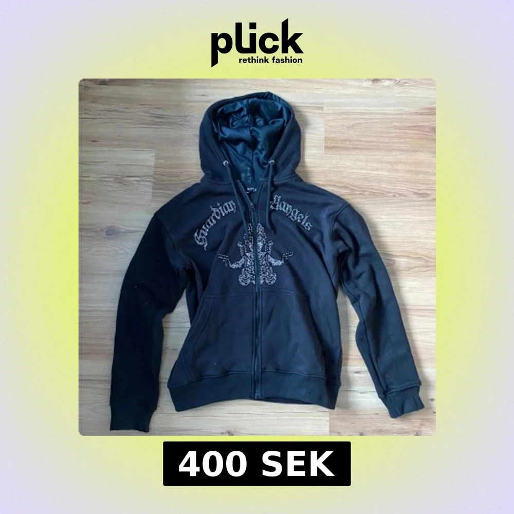 Snygg svart rhinestone hoodie från Blinglucid med dragkedja. Texten 'Guardian Angels' pryder framsidan tillsammans med ett coolt mönster. Alla rhinestones sitter kvar och tröjan har blivit tvättad för hand 1 gång. Bra skick på utsidan och helt okej skick på insidan. Storlek S. Nypris Ca 900kr, kan säljas för billigare vid snabb affär.