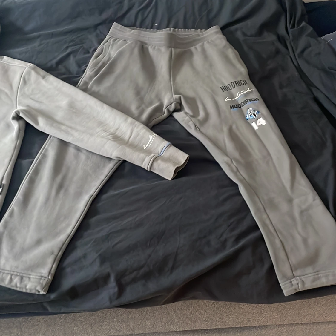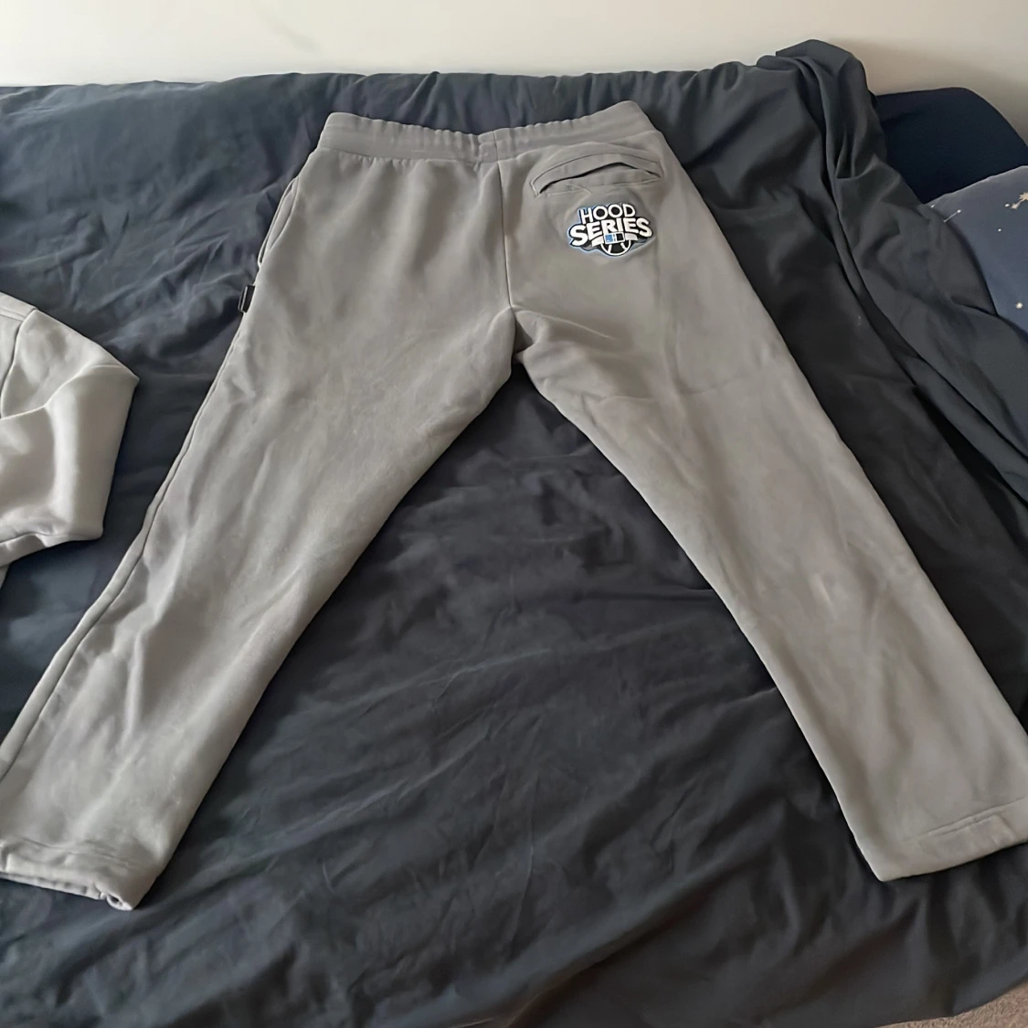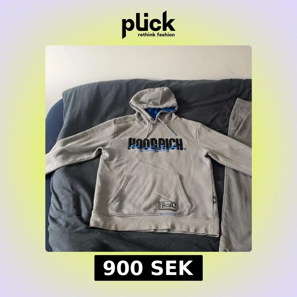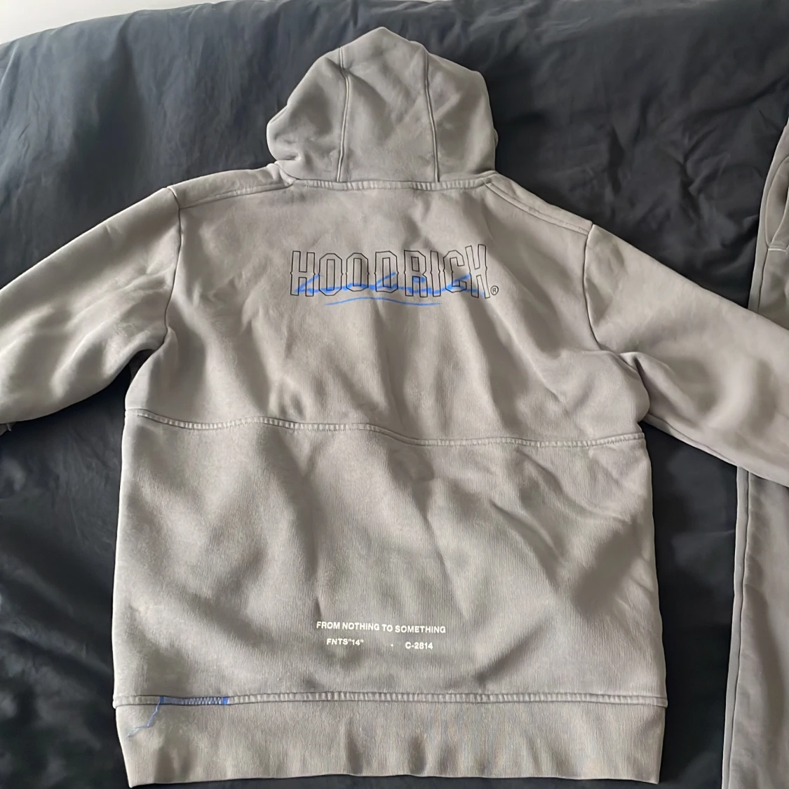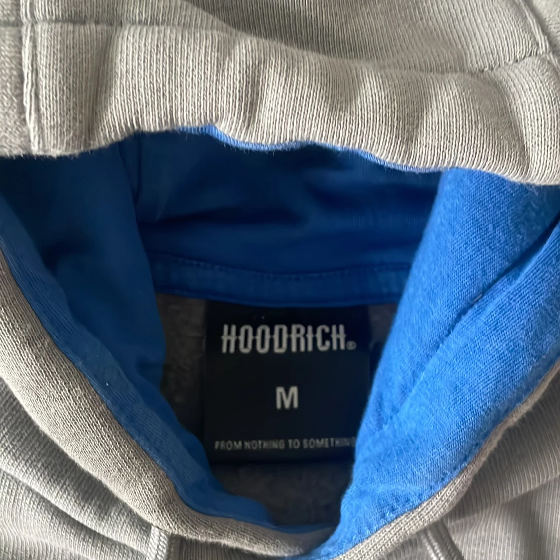 Säljer en fet dress från Hoodrich i storlek M. Byxorna har tryck och broderade detaljer i blått och vitt på ena benet, elastisk midja och muddar vid bensluten. Sköna och stilrena, perfekta för chill eller streetwear. Hoodien är även väldigt bekväm där de står skriver ”Hoodrich” Perfekt dress för dig som letar efter något ”chill”