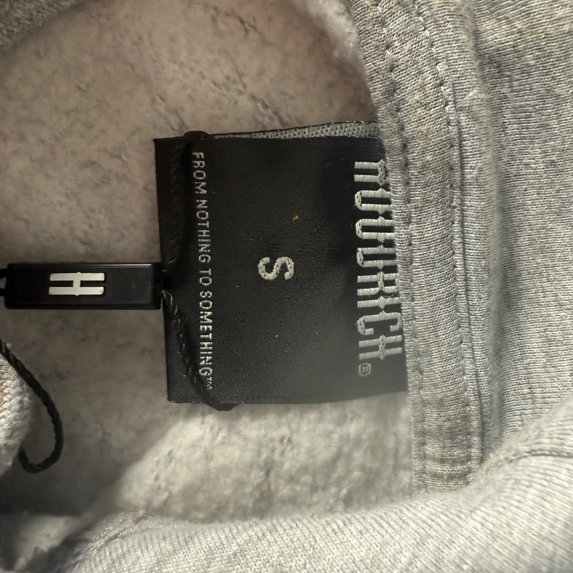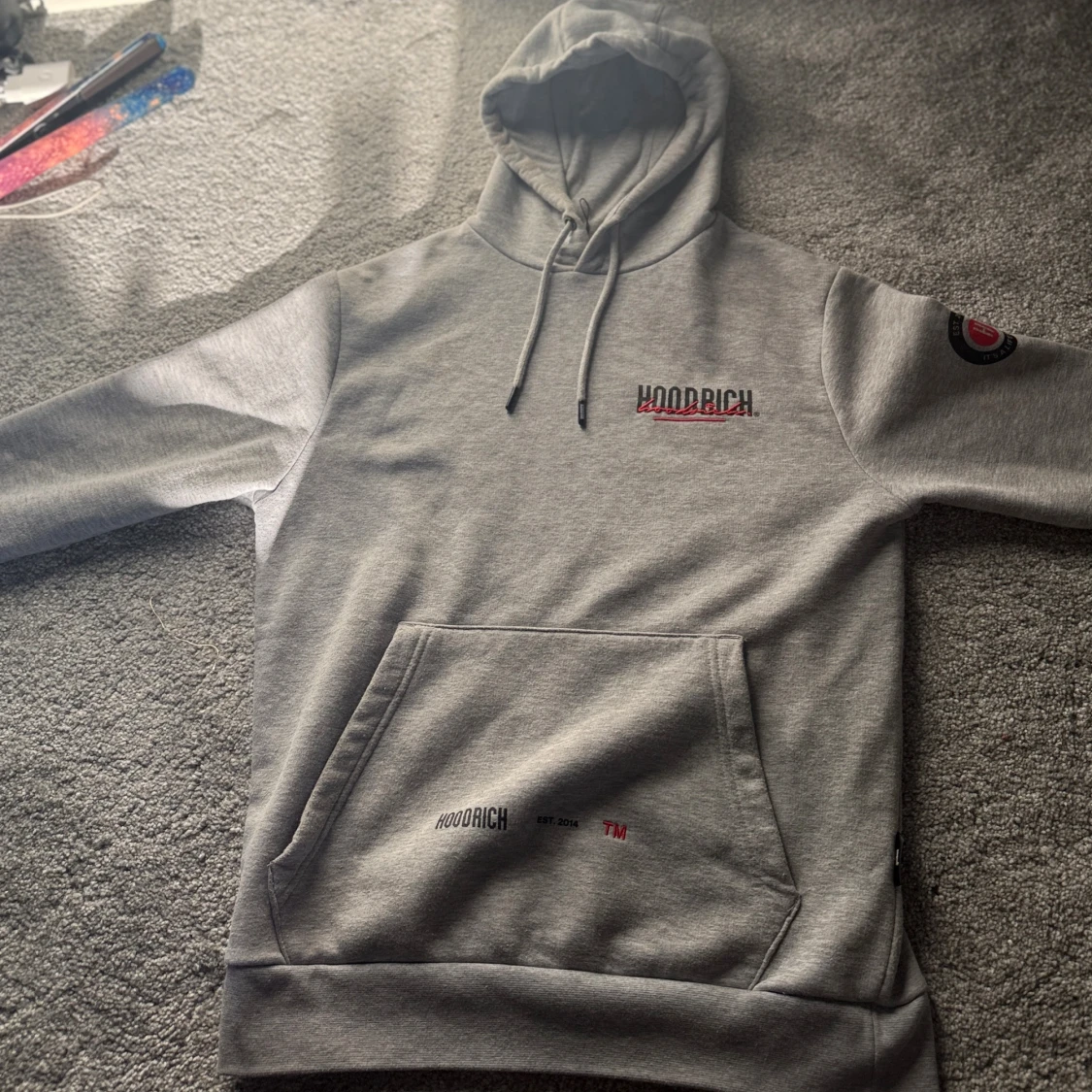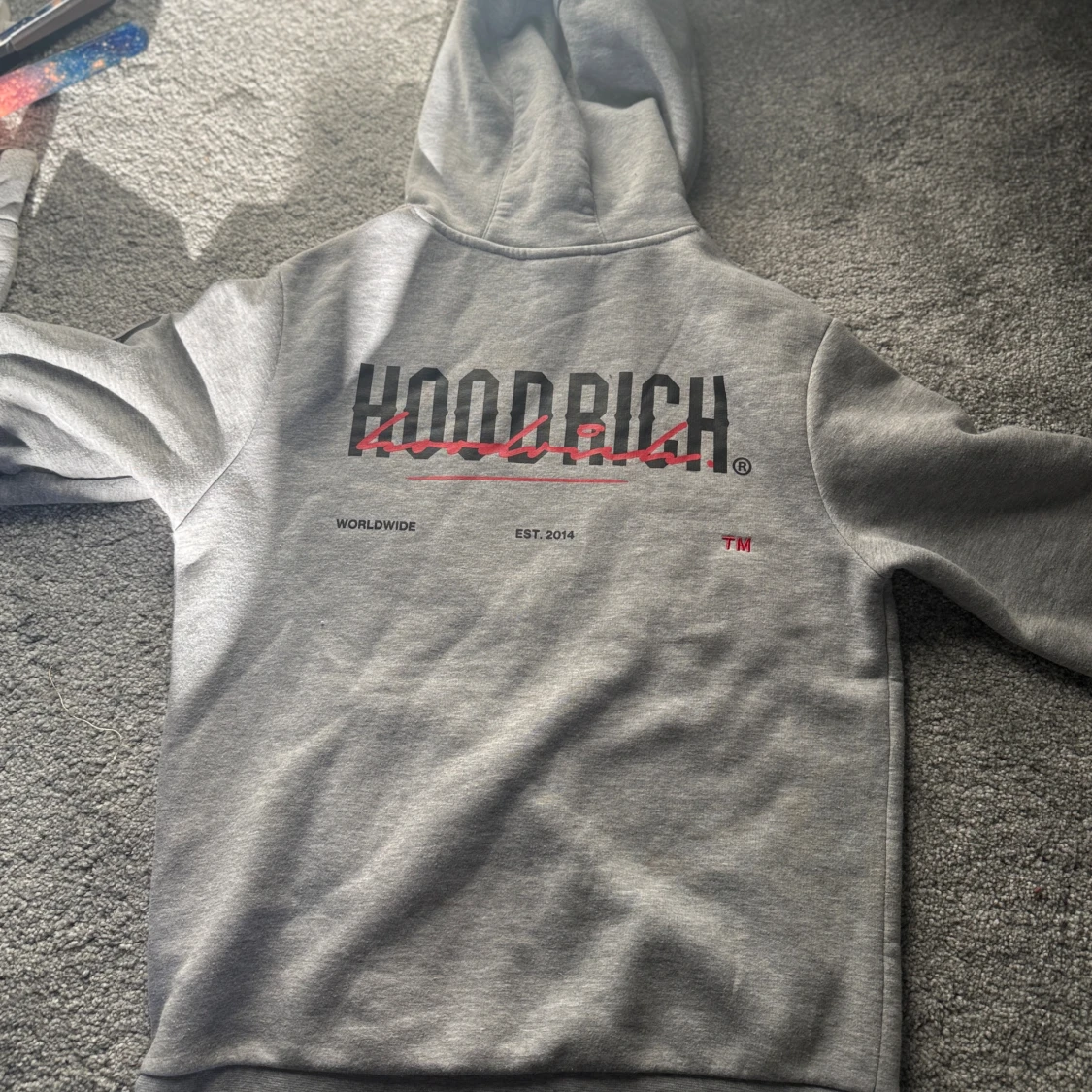 Säljer en grå hoodie från Hoodrich med svart och rött tryck både fram och bak. Tröjan har huva med snörning, stor magficka och tryckta detaljer på ärmarna.