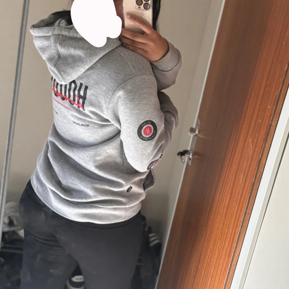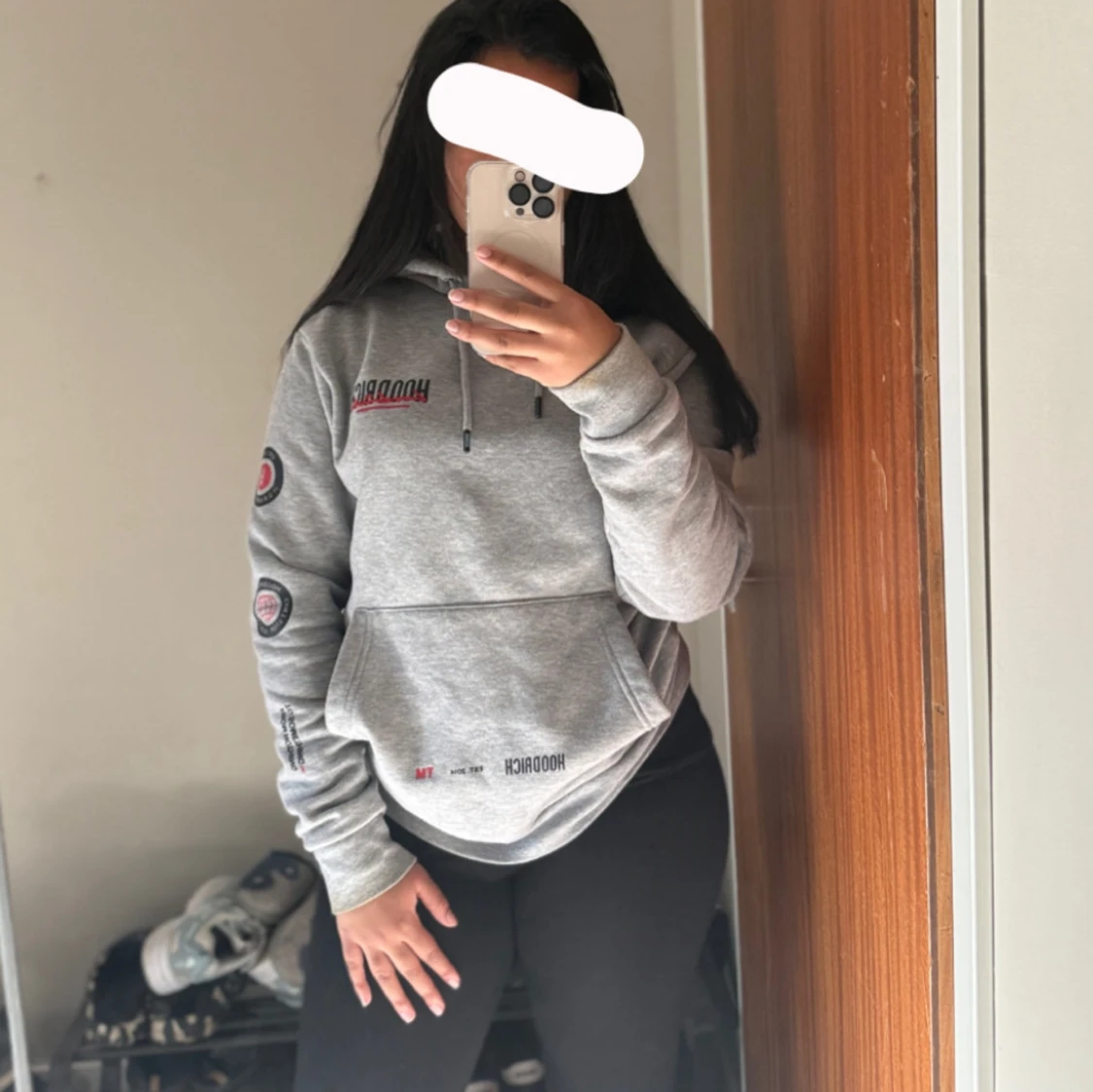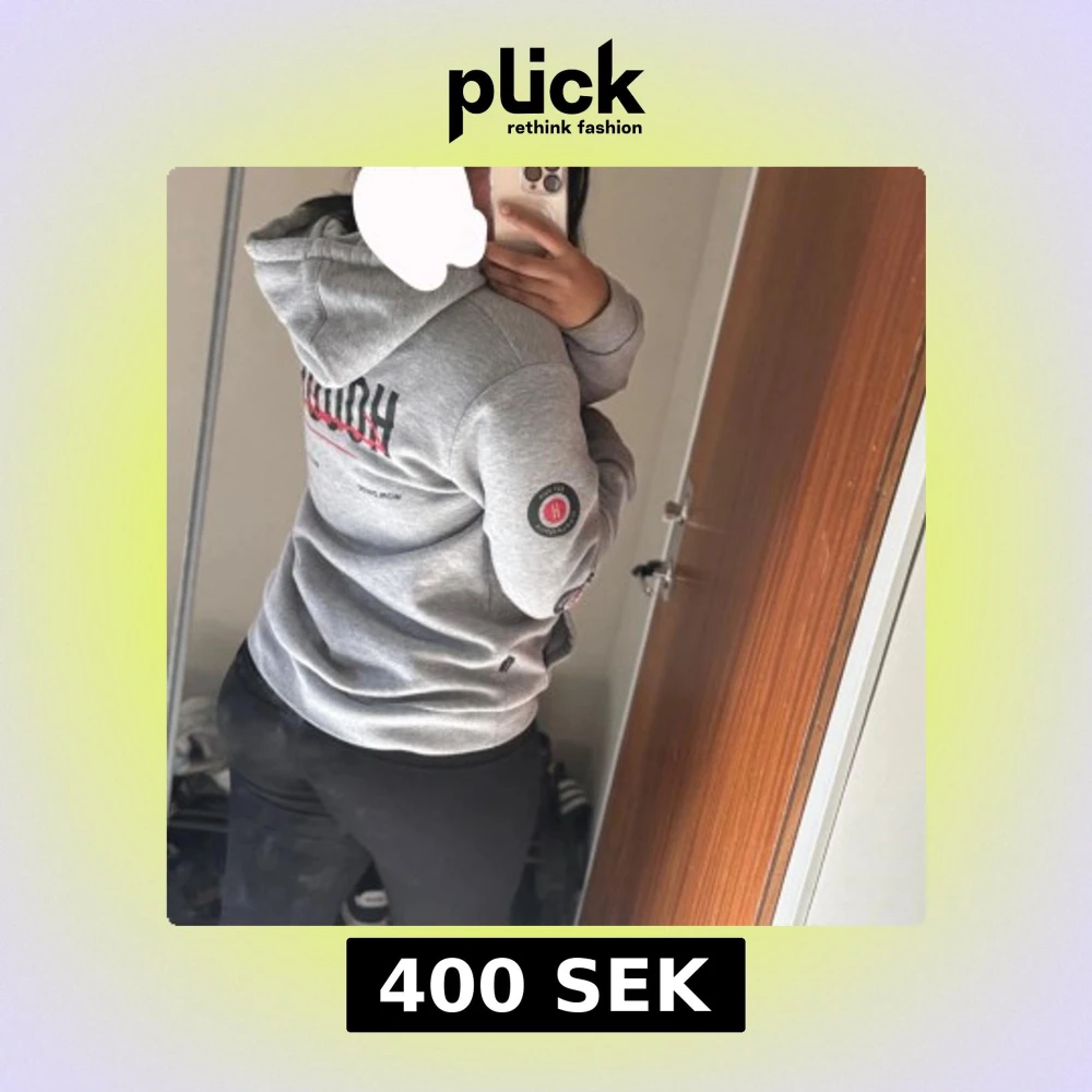 Säljer en grå hoodie från Hoodrich med svart och rött tryck både fram och bak. Tröjan har huva med snörning, stor magficka och tryckta detaljer på ärmarna.