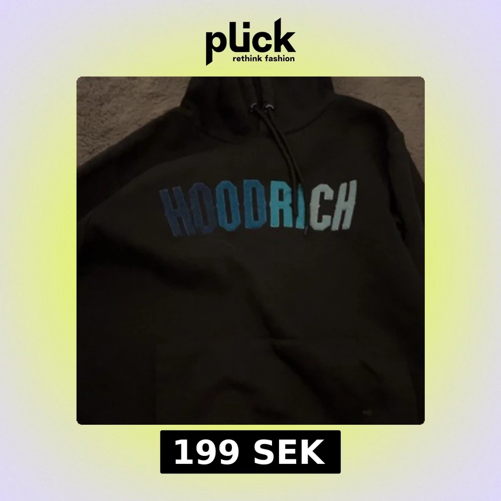 Svart hoodie från HOODRICH i storlek S. Stor HOODRICH-logga i blått och vitt framtill, klassisk känguruficka och justerbar huva med snören. Mjuk bomullskänsla och relaxed fit, perfekt för streetwear-stil.