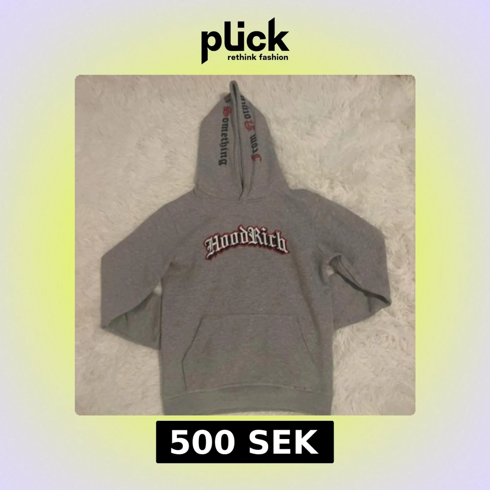 Säljer en grå hoodie från Hoodrich med texten 'Hoodrich' på bröstet och 'From Nothing To Something' på huvan. Hoodien har en klassisk passform med känguruficka framtill. Perfekt för en avslappnad stil. Som är i storlek XL i barn så ungefär s/xs i herr