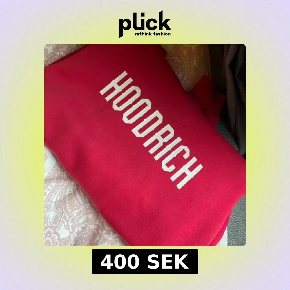 Snygg röd hoodie från HOODRICH i storlek XS. Tröjan har vit logga tryckt framtill. Köpte här på plick och har använt den typ två gånger sen dess då jag inte riktigt tycker röd är min färg, inget fel på den förutom att domhär sakerna som ska sitta på snörena har ramlat av, kan absolut diskutera priset!🙂🩷