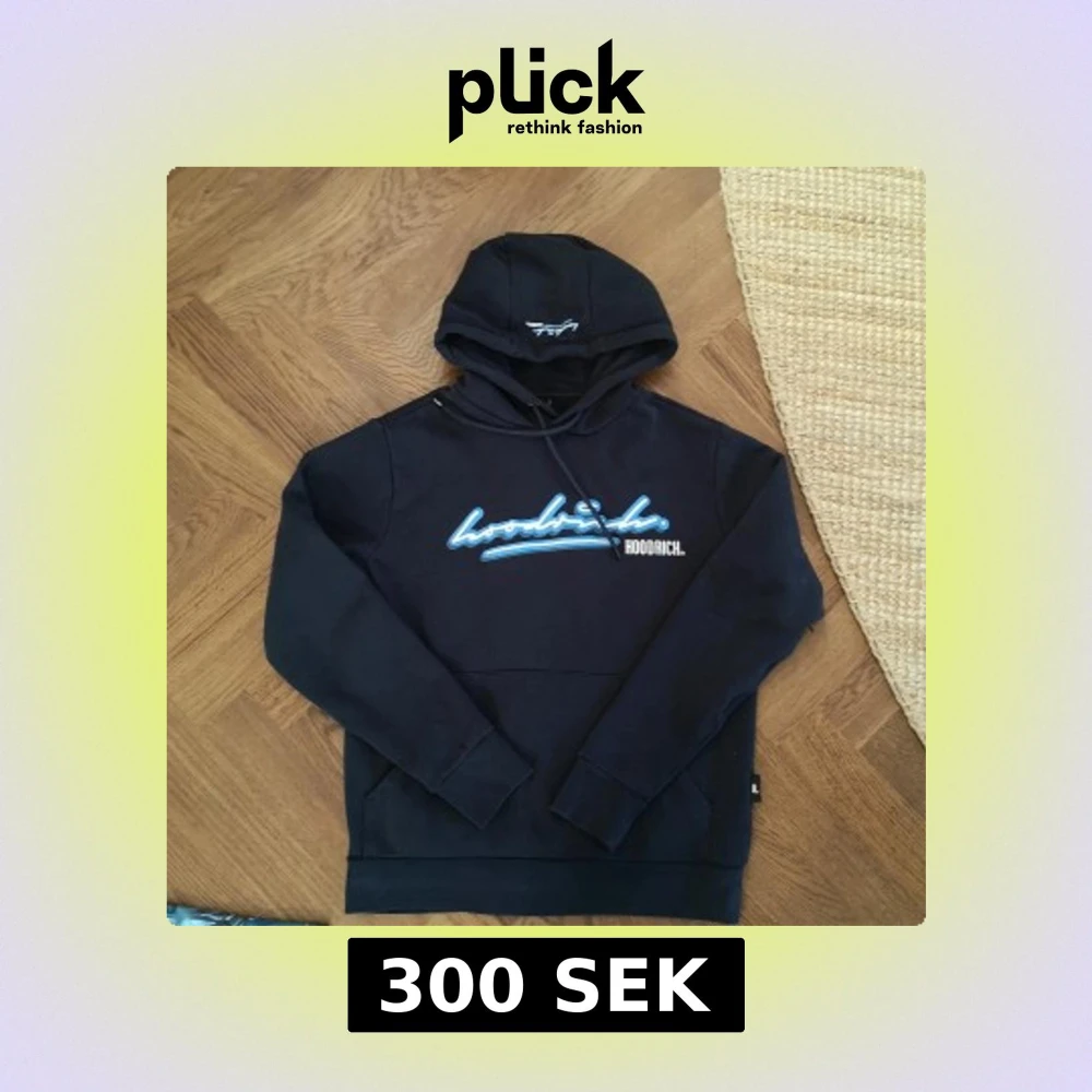 Svart hoodie från Hoodrich i storlek XS med blå och vit logga på bröstet och tryck på ryggen. Tröjan har huva med snörning och en stor magficka. Perfekt för dig som gillar streetwear och vill ha en chill look.