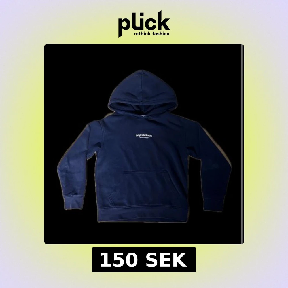 En mörkblå hoodie från Jack & Jones Originals Studio billigt pris med vit text på bröstet. Tröjan har huva och magficka. En perfekt vardags hoodie enkel att matcha andra klädesplagg! Hoodien har storlek 152 i fint skick och tvättas innan leverans. Tveka inte om ni har några funderingar!🌟