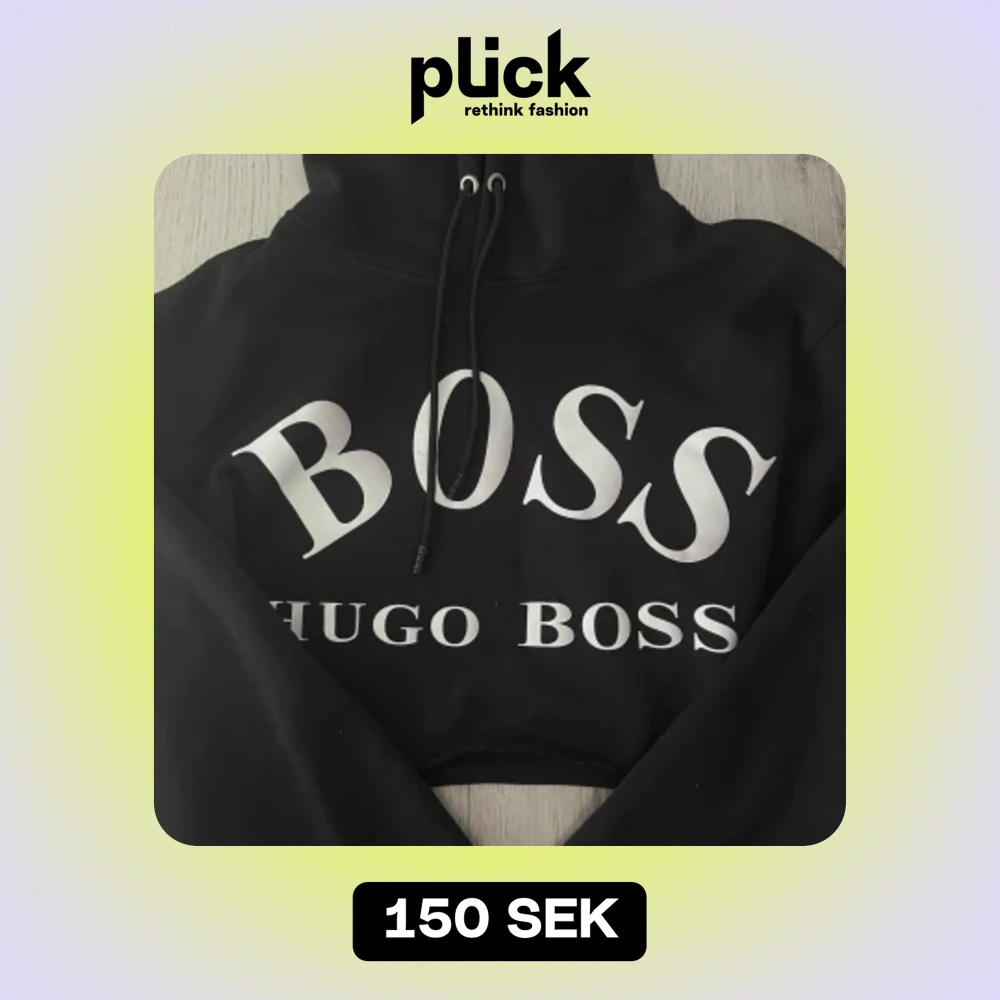 Croppad hugo boss hoodie i strlk L men skulle säga att den sitter mer som M typ . Skriv för fler bilder eller frågor💕