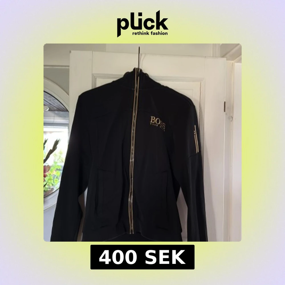 Svart vindjacka från Hugo Boss med guldig logga på bröstet och dragkedja framtill. Jackan har hög krage, långa ärmar och diskreta fickor. Snygga guldiga detaljer på ärmen och dragkedjan ger en exklusiv känsla. Perfekt för dig som gillar stilrena och sportiga plagg.