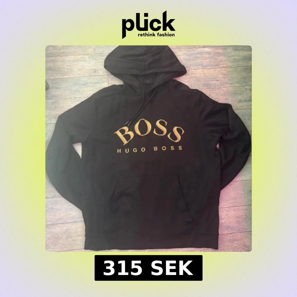Svart hoodie från Hugo Boss med stor guldfärgad BOSS-logga på bröstet. Klassisk modell med huva, snörning och känguruficka. Perfekt för dig som gillar stilrena streetwear-plagg med premiumkänsla. (Använt den ganska mycket, fast finns inge skador elle något), pris kan diskuteras