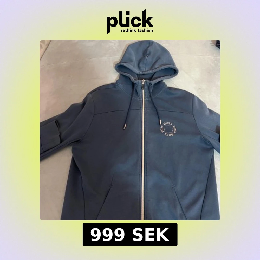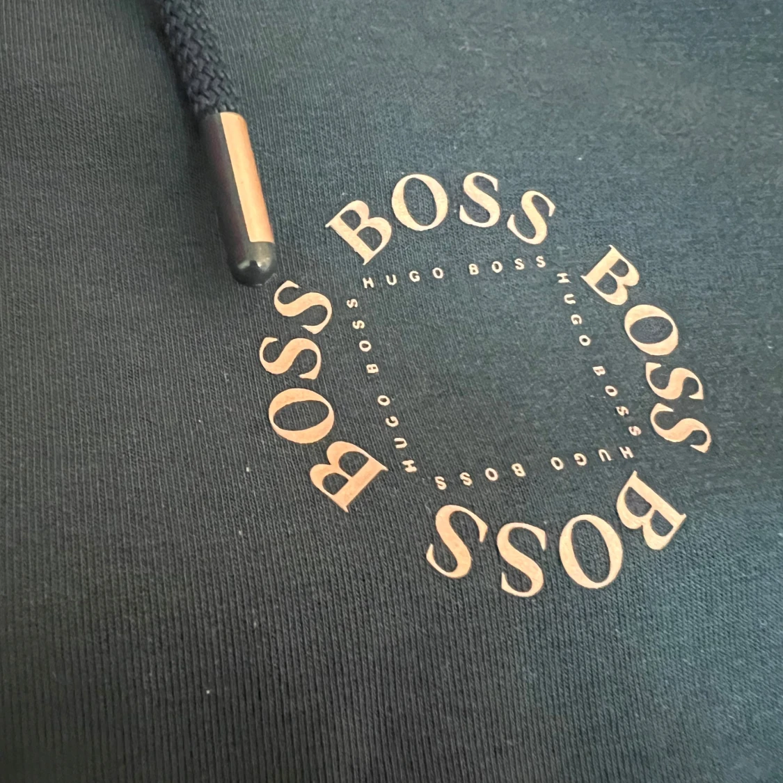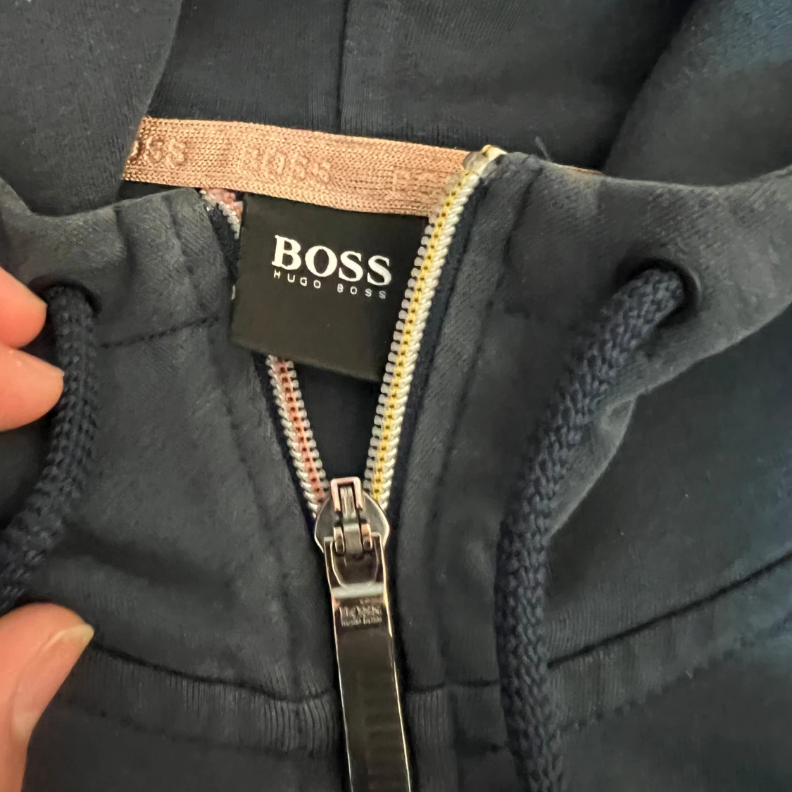Snygg mörkblå huvtröja från Hugo Boss med dragkedja och justerbar huva. Tröjan har ett stilrent tryck med BOSS-loggan på bröstet och ribbade muddar vid ärmslut.