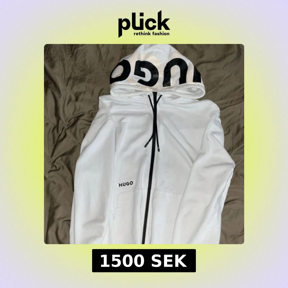 Vit hoodie från Hugo med svart logotyptryck på huvan och svart dragkedja. Klassisk passform med fickor framtill och justerbar huva med snörning. Perfekt för en stilren och avslappnad look. Väldigt sällsynt model säljs ej längre