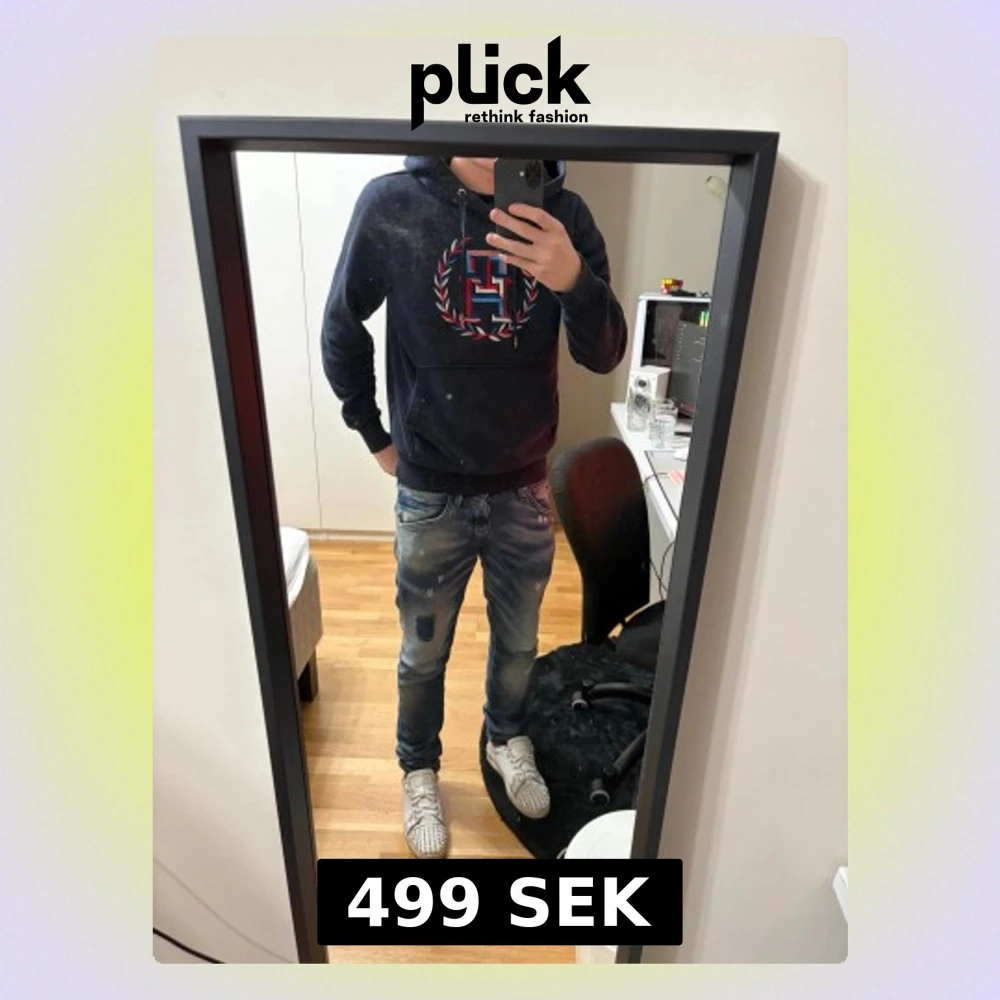 Säljer en mörkblå hoodie från Tommy Hilfiger i storlek S. Den har broderad logga i rött, blått och vitt på bröstet, dragsko i huvan och en stor magficka. Väldigt skönt material, nypris 2000kr, jag är 181 72kg! BVSA