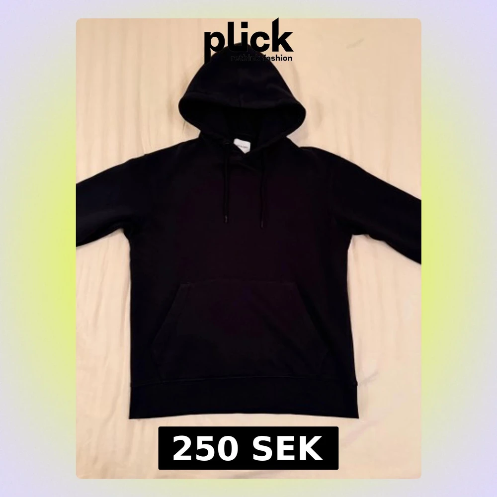 Svart hoodie från Jack & Jones med klassisk design, huva med snörning och stor magficka framtill. Tröjan har långa ärmar och ribbade muddar vid ärmslut och nederkant. Hoodien är i helt nytt skick förutom att en av snörsluten har slitage som ni ser på sista bilden