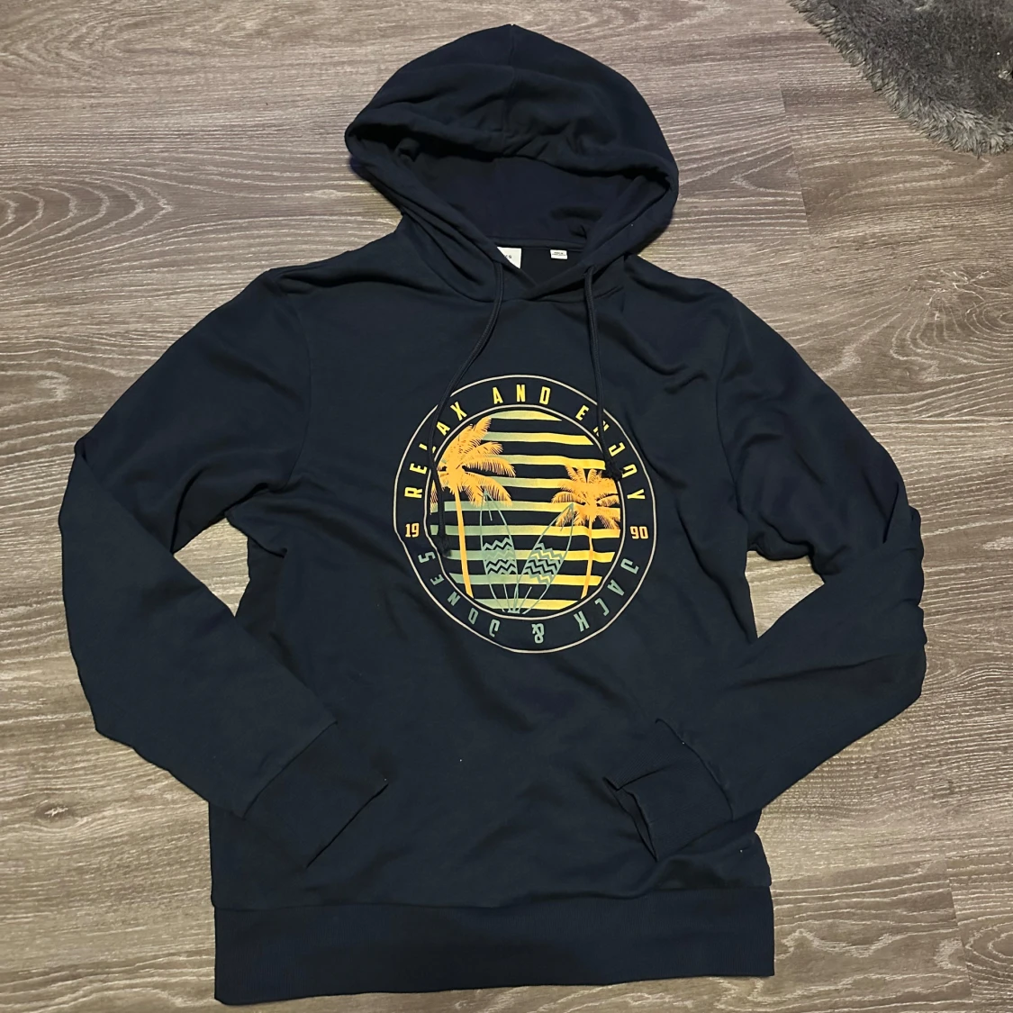 Säljer en svart hoodie från Jack & Jones med storlek S och ett coolt tryck av en solnedgång och palmer på framsidan. Tröjan har en klassisk huva med dragsko och långa ärmar. Perfekt för en avslappnad stil.