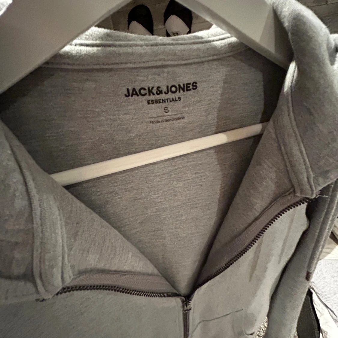 Säljer en stilren grå hoodie från Jack & Jones Essentials. Tröjan har dragkedja framtill, två fickor och justerbar huva med snören. Perfekt för chill dagar eller när du vill ha en enkel och clean look. Materialet är mjukt och skönt i bomullsmix.
