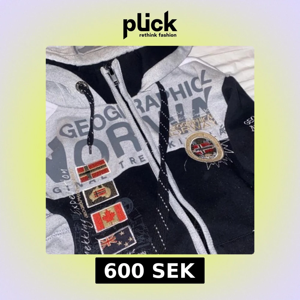 Snygg huvtröja i svart och grått från Geographical Norway med dragkedja och broderade flaggor. Tröjan har en justerbar huva med snörning och flera detaljerade tryck och broderier på framsidan.🇳🇴