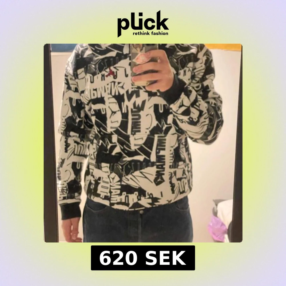 Säljer en cool svartvit hoodie från Jordan med ett unikt grafiskt mönster och den ikoniska röda Jumpman-loggan. Hoodien har långa ärmar och en dragkedja framtill. Perfekt för streetwear-stilen!