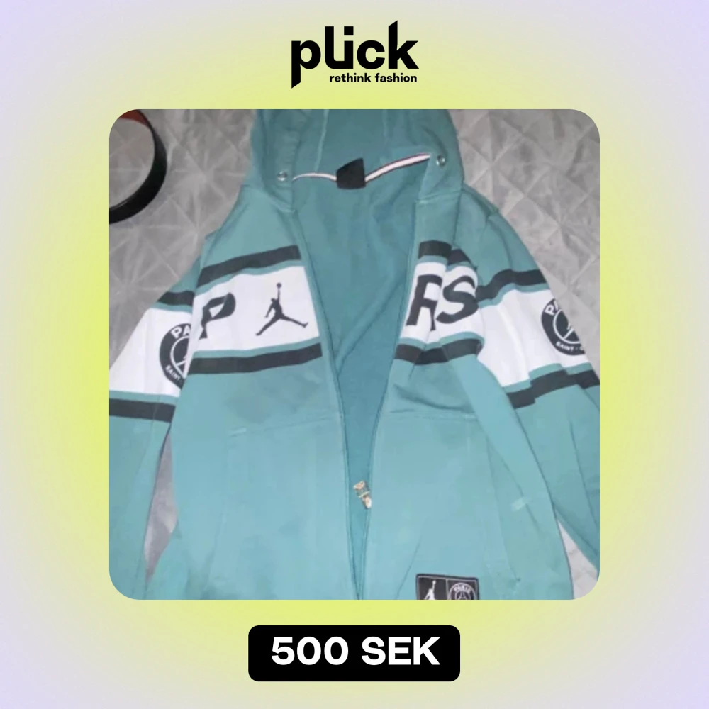 Säljer en snygg turkos hoodie från Jordan med dragkedja. Den har en cool design med svarta och vita detaljer samt en stor logga på ärmarna. Perfekt för vardagsbruk eller sportiga aktiviteter. Huvan är justerbar och det finns praktiska fickor framtill.