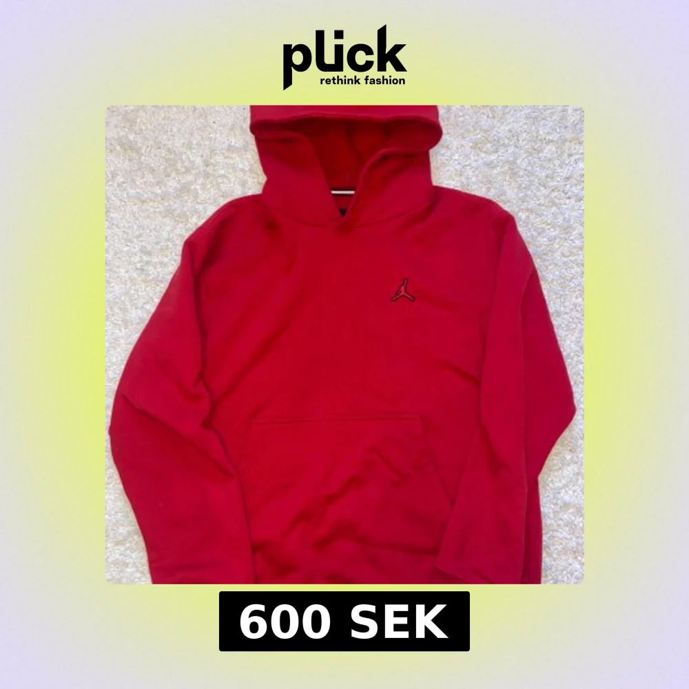 Säljer en snygg röd hoodie från Jordan med klassisk känguruficka och justerbar huva. Perfekt för en sportig look eller avslappnad stil. Den har en liten logga på bröstet och är tillverkad i mjukt material för extra komfort.