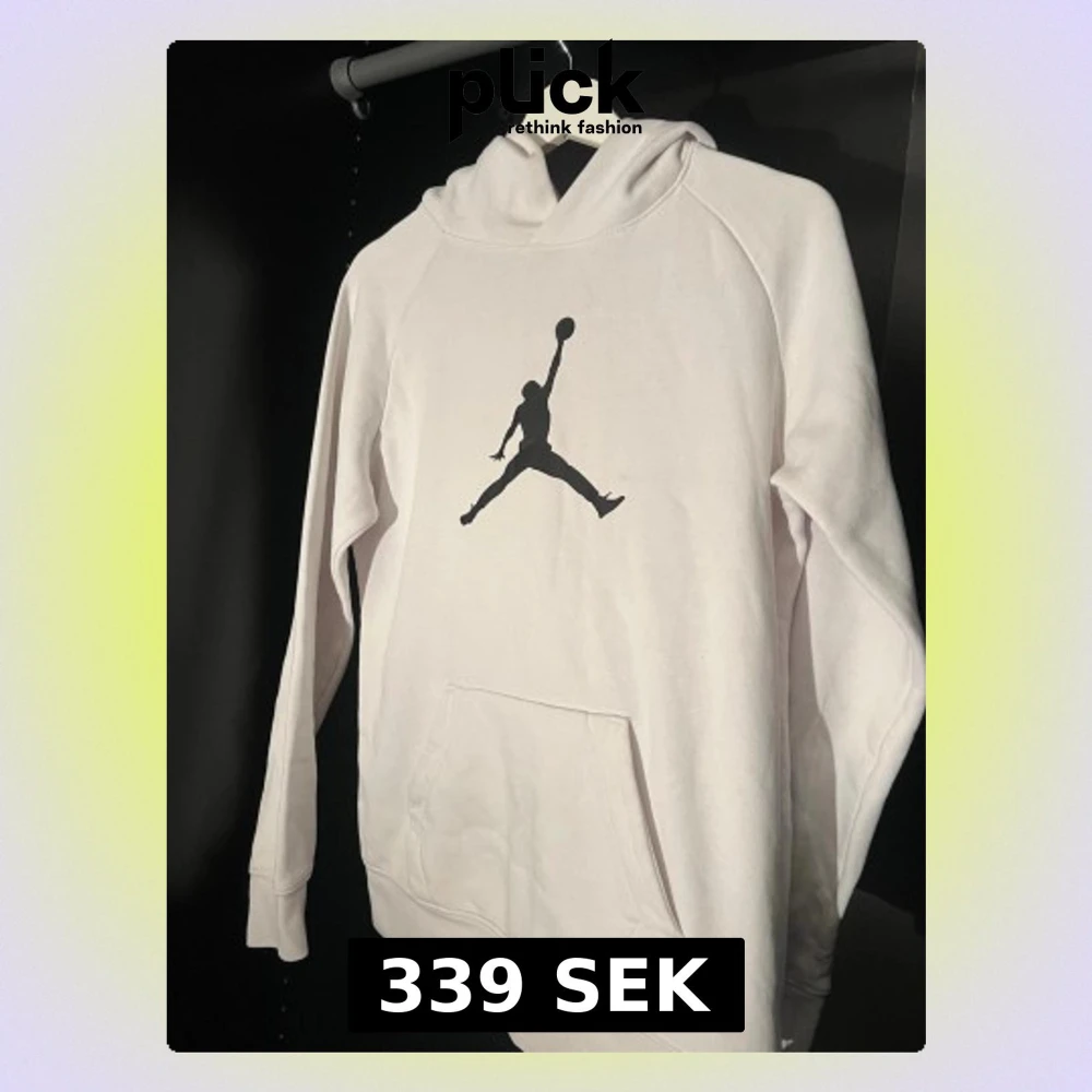 Säljer en vit hoodie från Jordan med den klassiska svarta Jumpman-loggan på bröstet. Hoodien har känguruficka framtill och huva. Perfekt för dig som gillar sportig och clean stil. Den sitter vanligt på S storlek men kan sitta slim fit på M