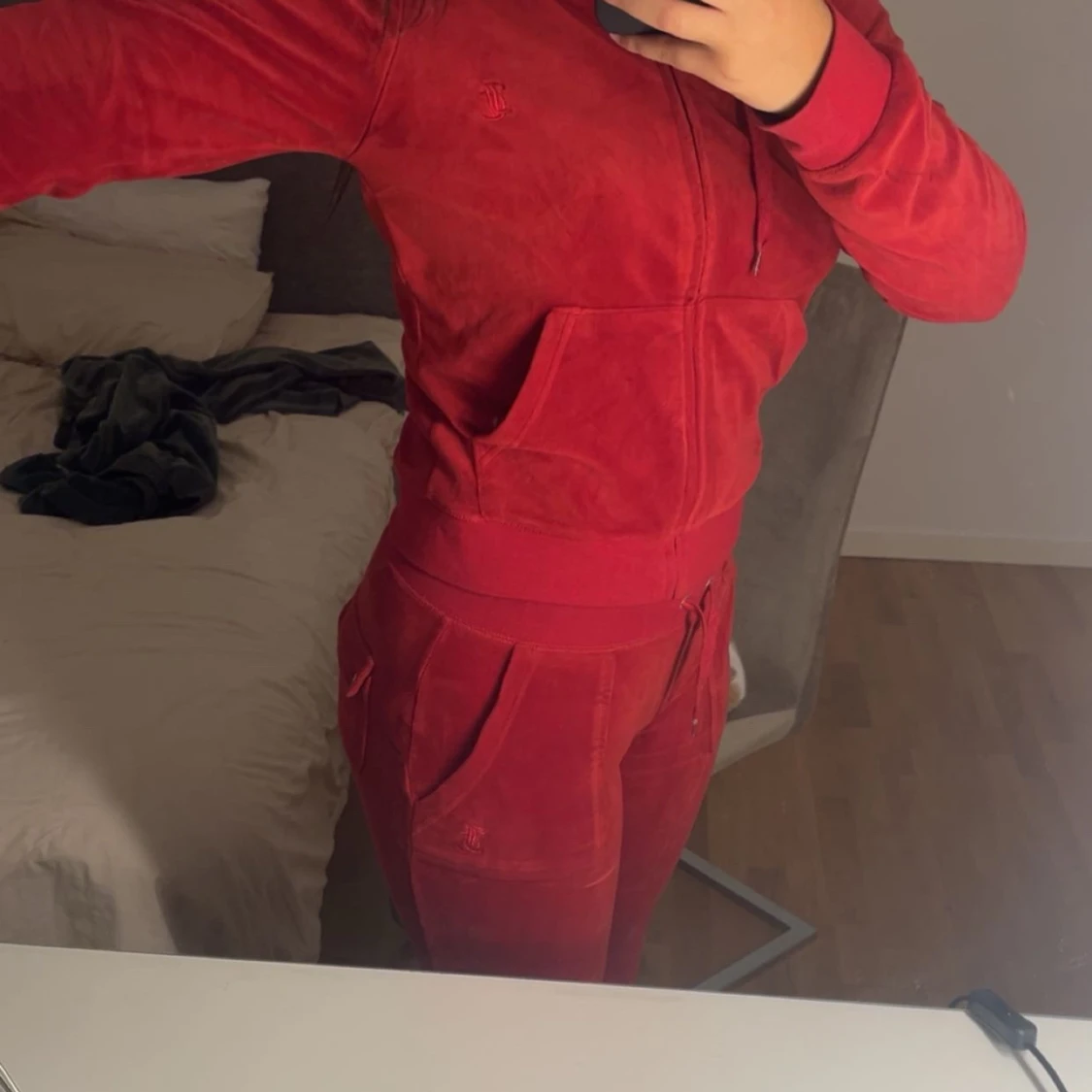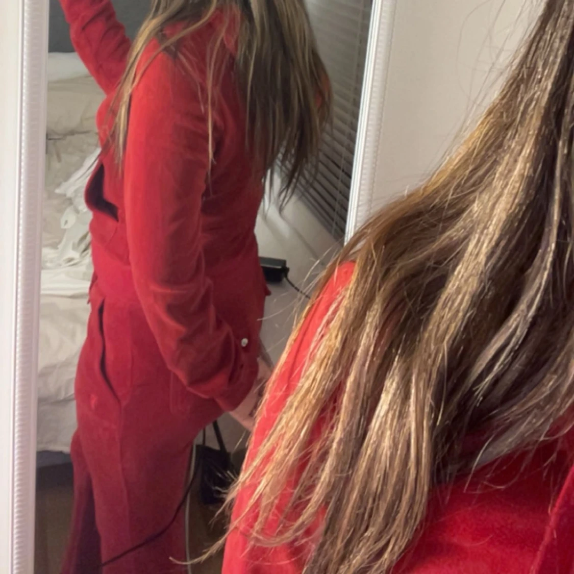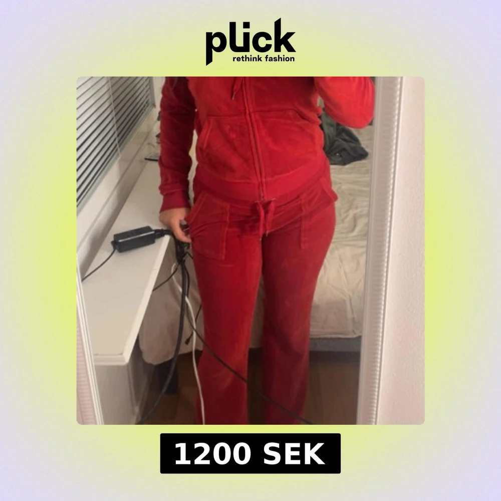 Säljer ett par röda mjukisbyxor i mjuk velour med bred resår i midjan och snörning. Byxorna har raka ben, fickor framtill och en chill vibe. Perfekta för dig som gillar comfy och snyggt på samma gång. De ända fel med dom är snöret så finns de en metall på. Alla har åkt av!
