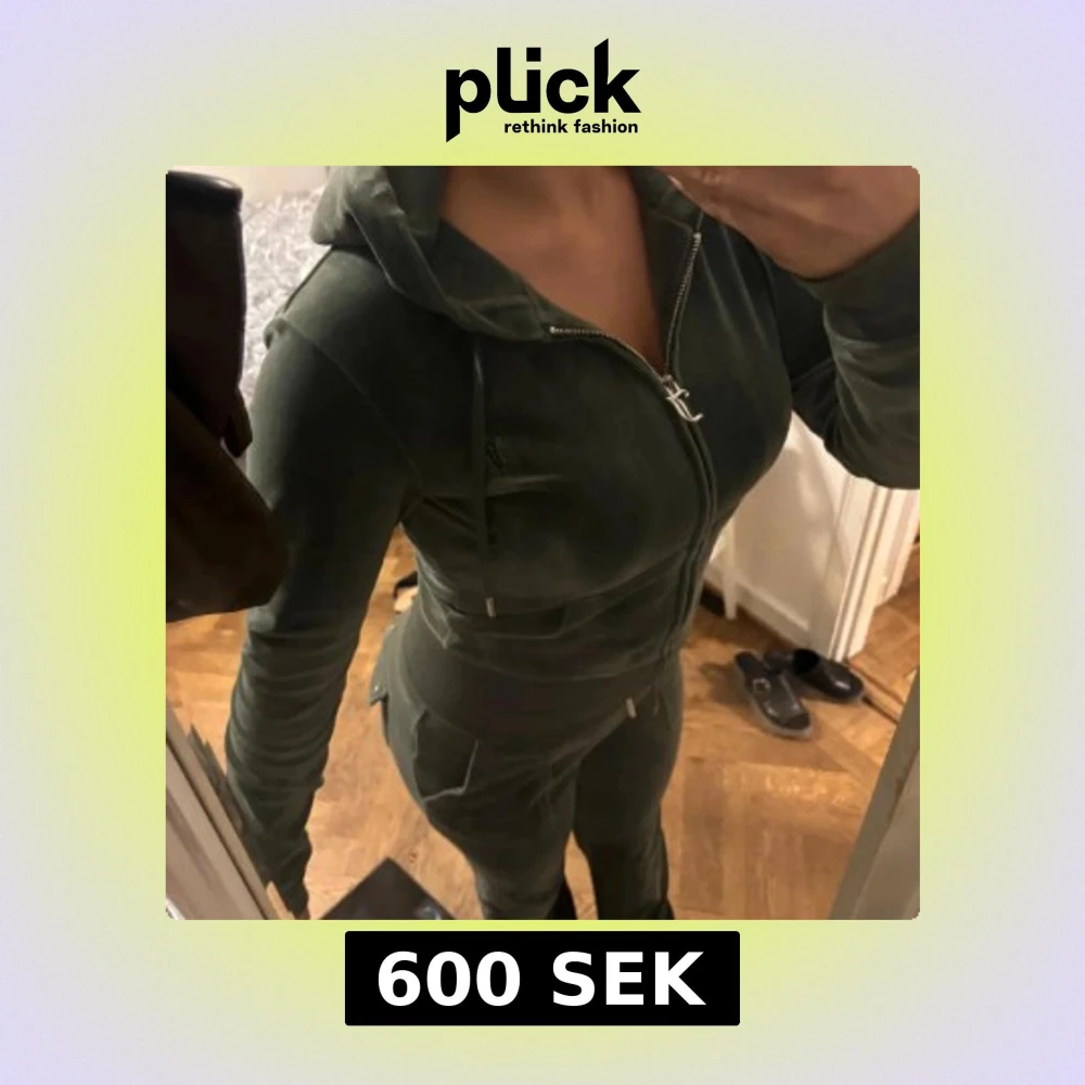 Mjuk och snygg mörkgrön hoodie från Juicy Couture i velour med dragkedja och huva. Tröjan har snörning vid halsen, långa ärmar och en broderad JC-logga på bröstet. Perfekt för chill eller träning, matcha med de tillhörande byxorna för en komplett look.