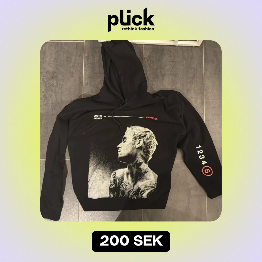 Säljer en svart hoodie från H&M med ett coolt Justin Bieber-tryck på framsidan. Texten 'CHANGES' i rött och '1234 (5)' på ärmen ger den en unik touch. Perfekt för alla Beliebers! 🖤 använd 2 gånger endast