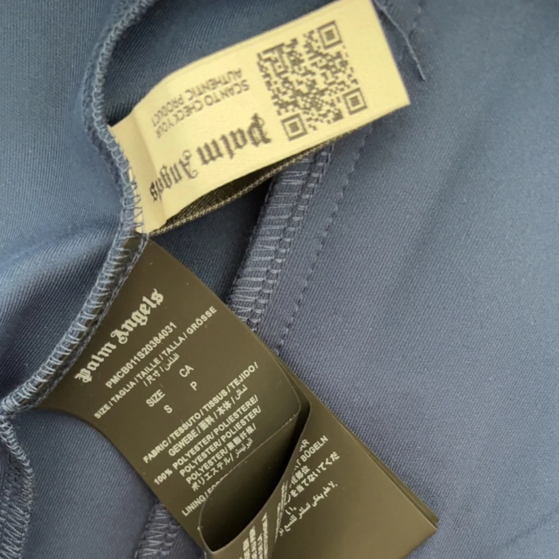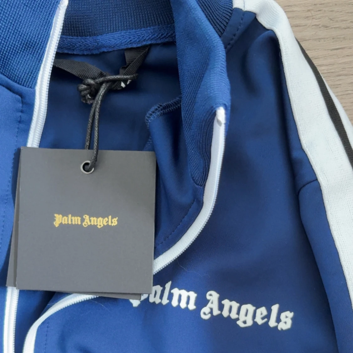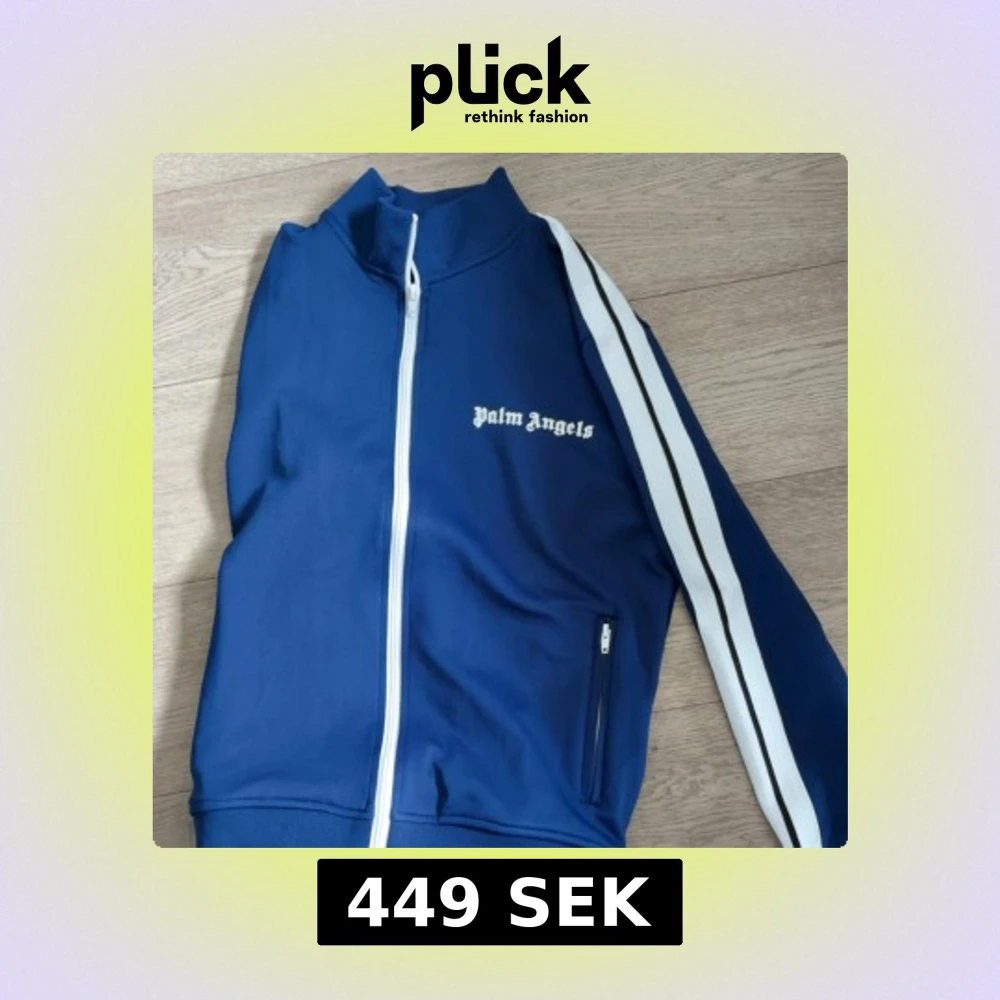 Säljer en blå zip ett set ifrån traksuiten från Palm Angels med vita ränder längs ärmarna och vit dragkedja. Jackan har hög krage, fickor med dragkedja och logga på bröstet. Tillverkad i polyester och har en sportig vibe. Perfekt för dig som gillar streetwear.