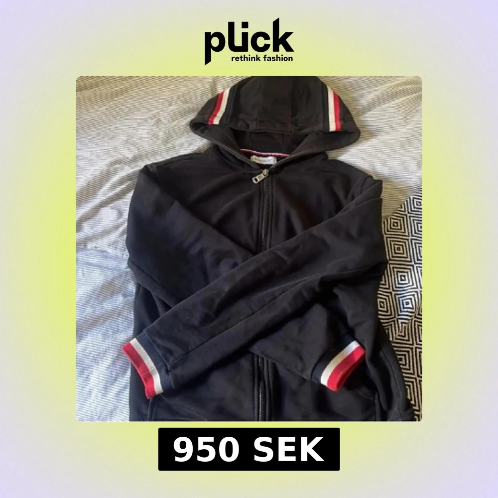 Svart hoodie från Moncler med dragkedja framtill och huva. Ribbade muddar och huva har röd, vit och blå randig detalj. Moncler-logga på ärmen. Perfekt för dig som gillar streetwear och snygga detaljer.