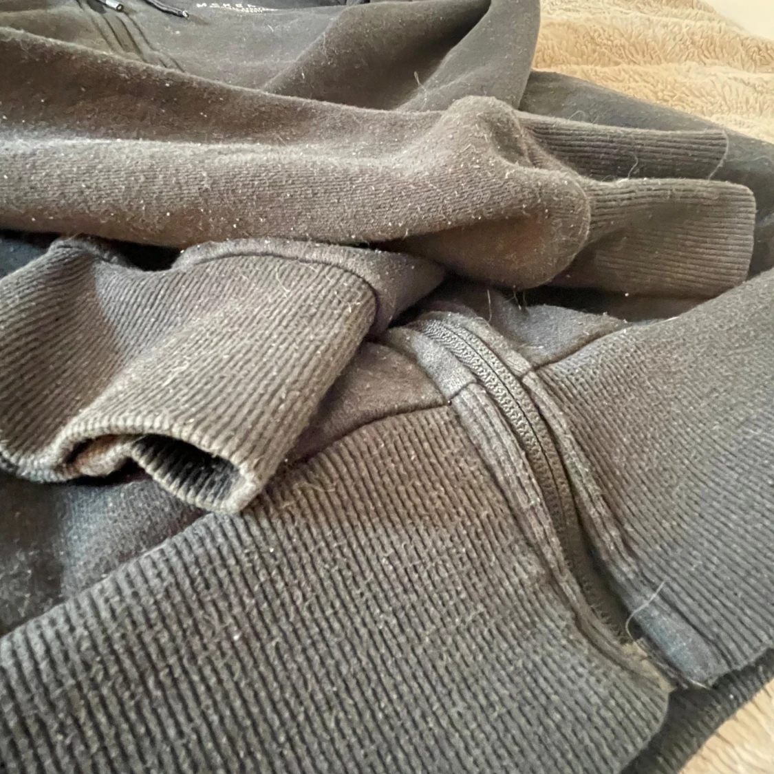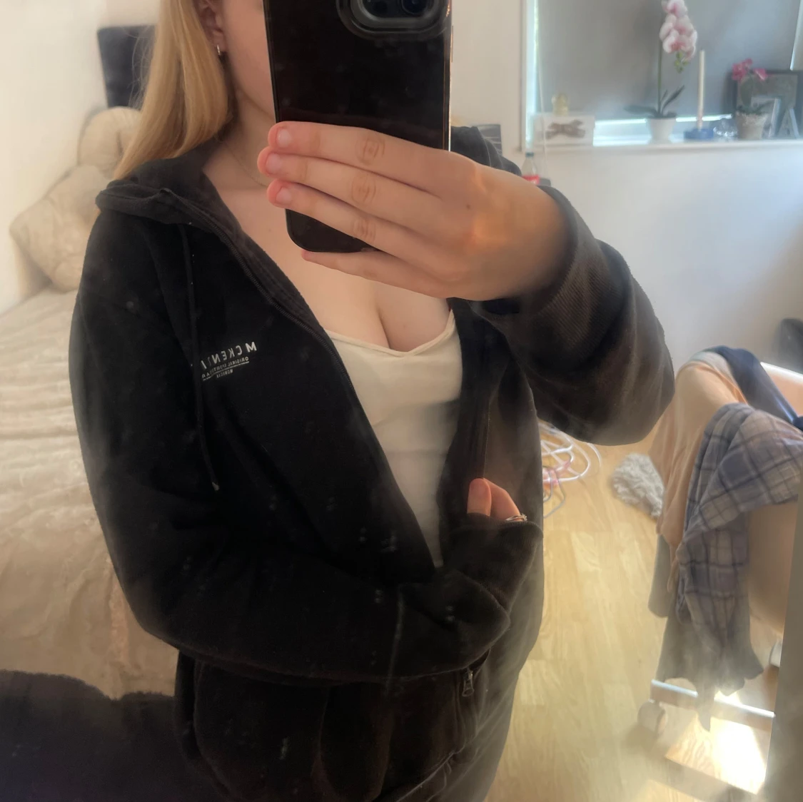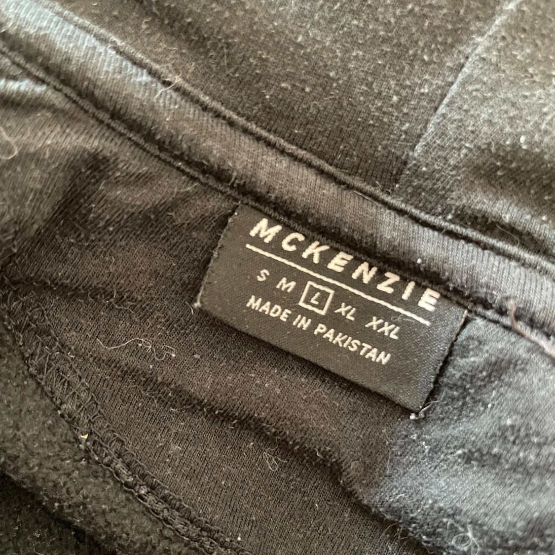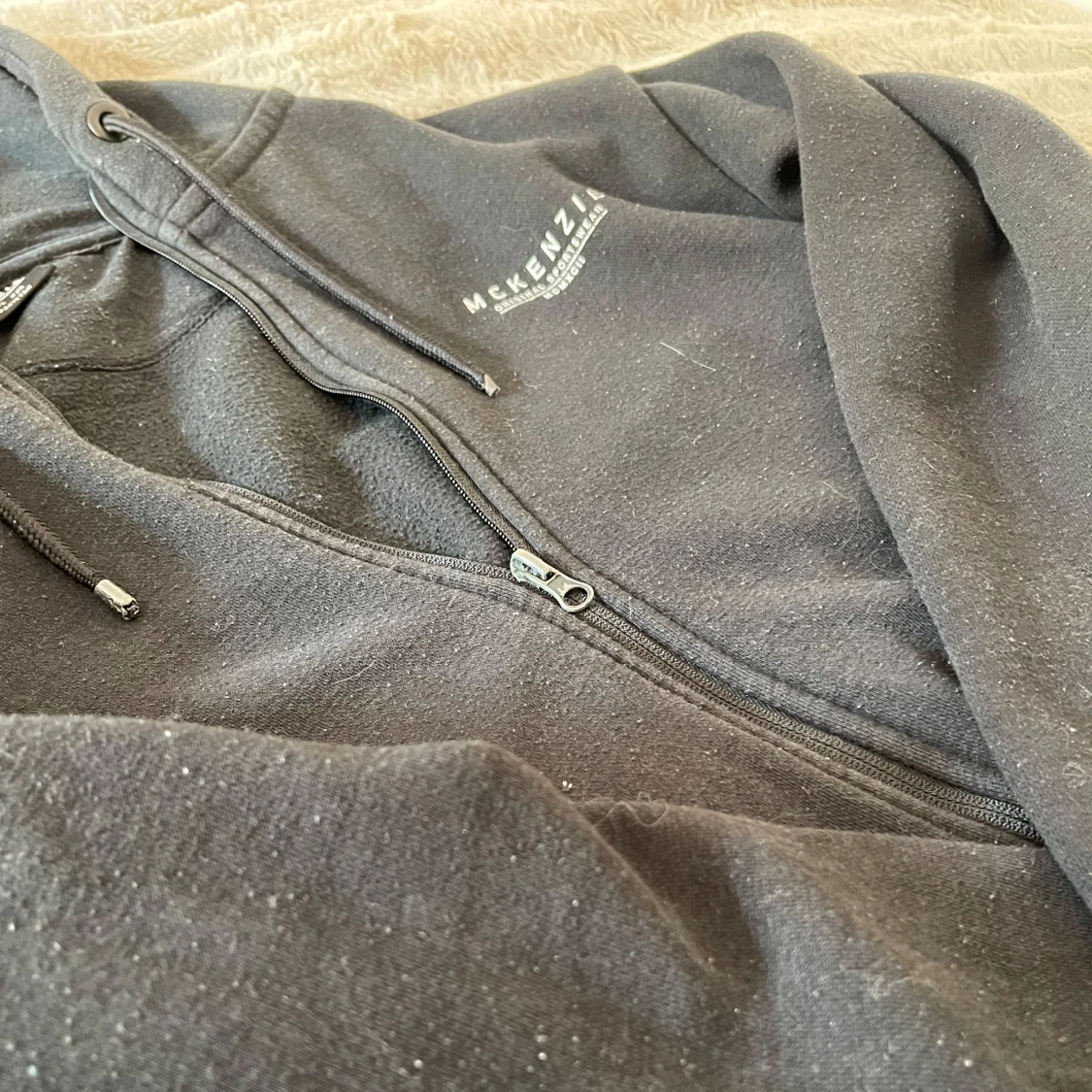 Svart hoodie med dragkedja från McKenzie, har huva med snörning. Mjuk insida och enkel logga på bröstet. Perfekt för kyligare dagar/kvällar eller när du vill ha en enkel och skön look.