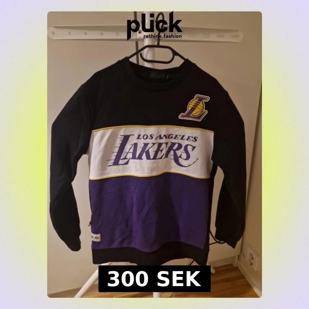 Snygg Los Angeles Lakers crewneck i svart, vitt och lila med stort Lakers-tryck och logga på bröstet. Tröjan har ribbade muddar och är tillverkad i mjukt bomullsmaterial. Perfekt för dig som älskar basket och vill ha en sportig stil.