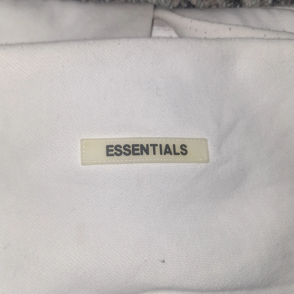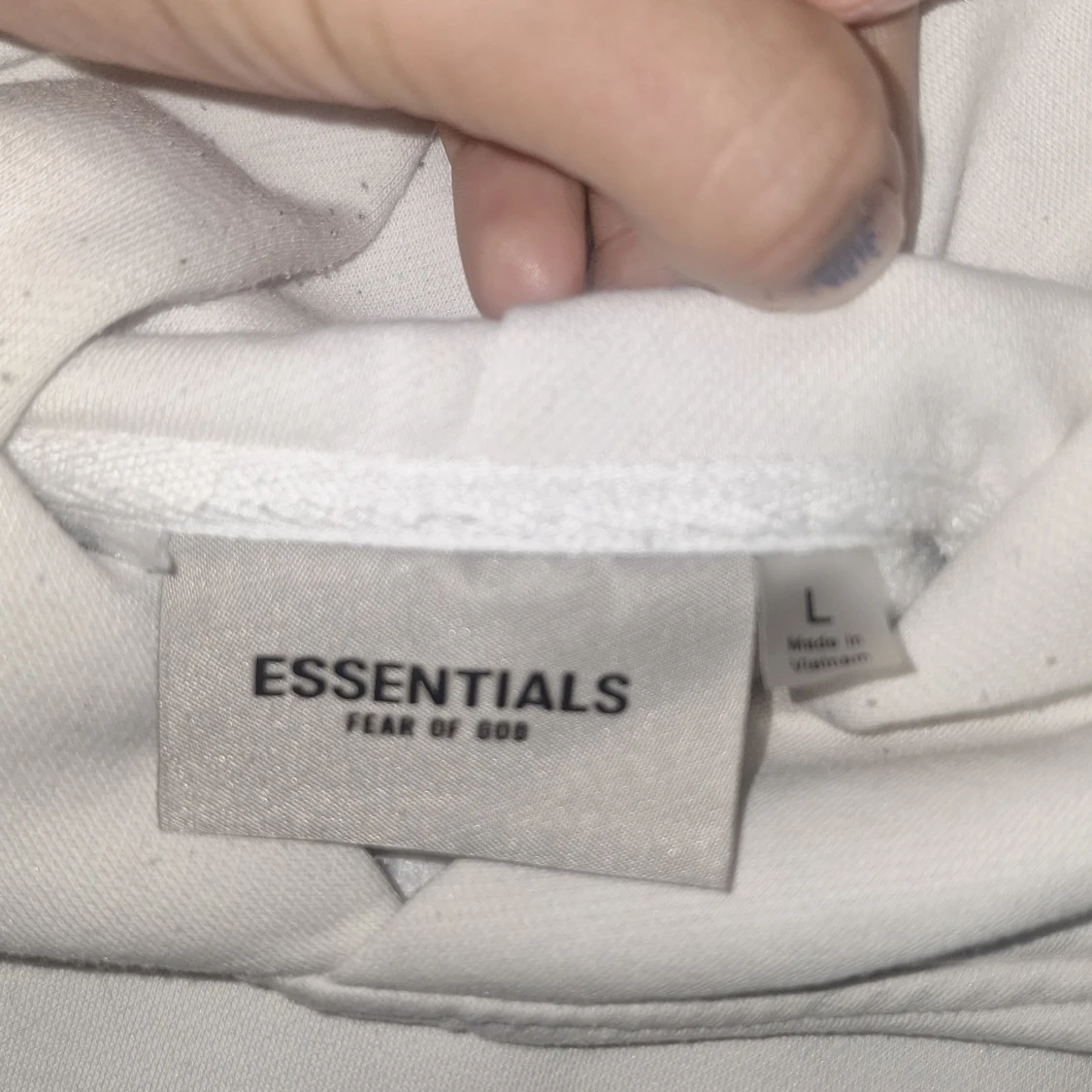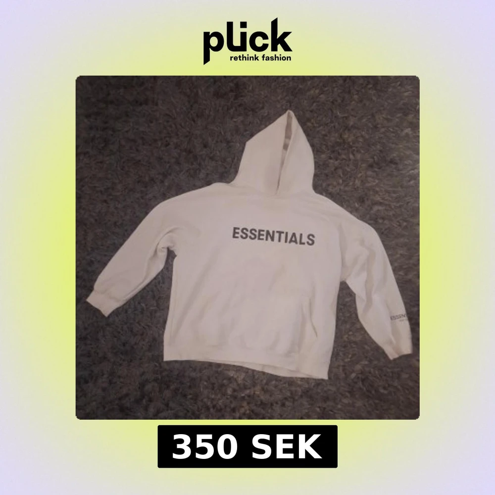 Vit hoodie från Essentials Fear of God med svart tryck på bröstet och ärmen. Klassisk känguruficka framtill, ribbade muddar och stor huva. Perfekt för en clean och avslappnad streetstyle-look.