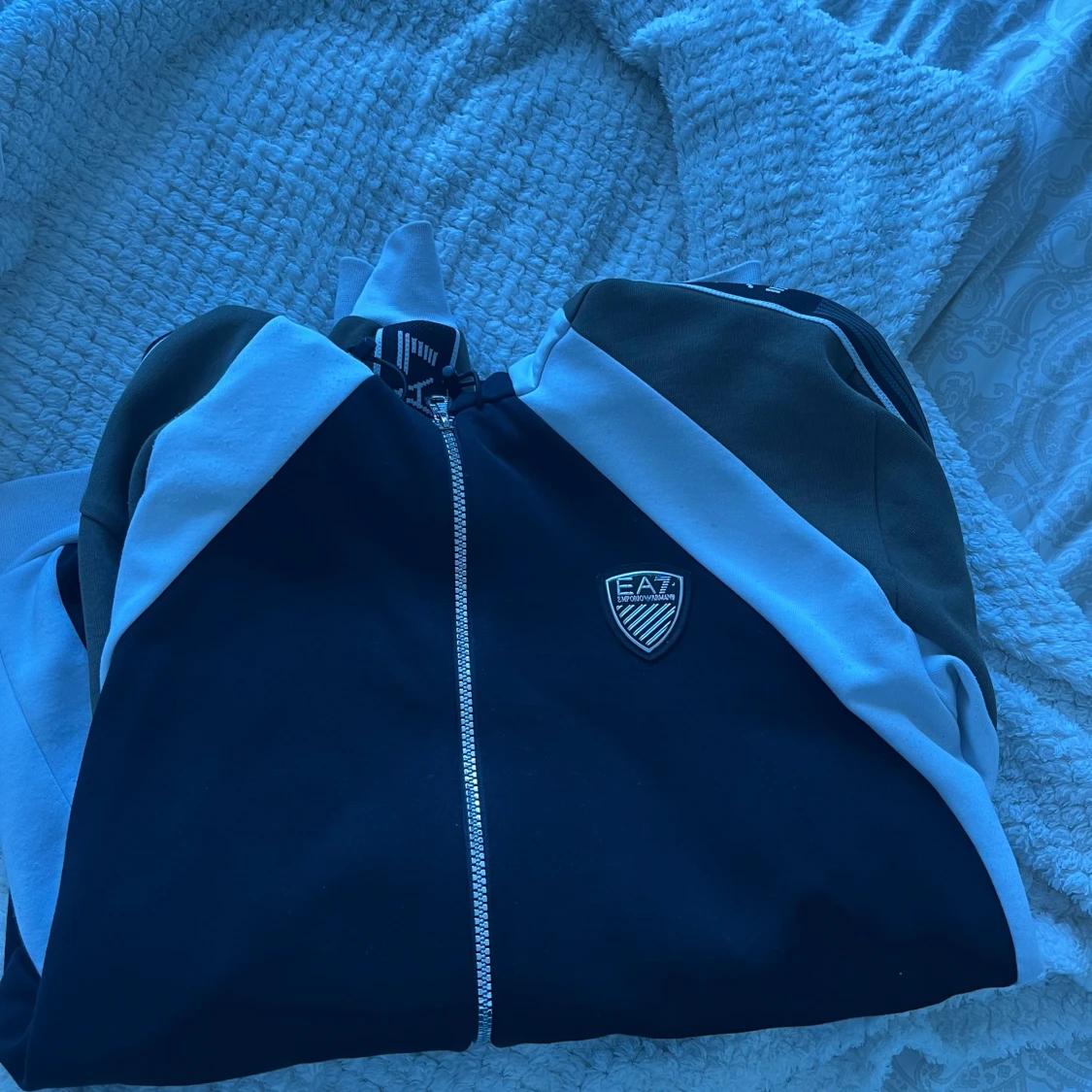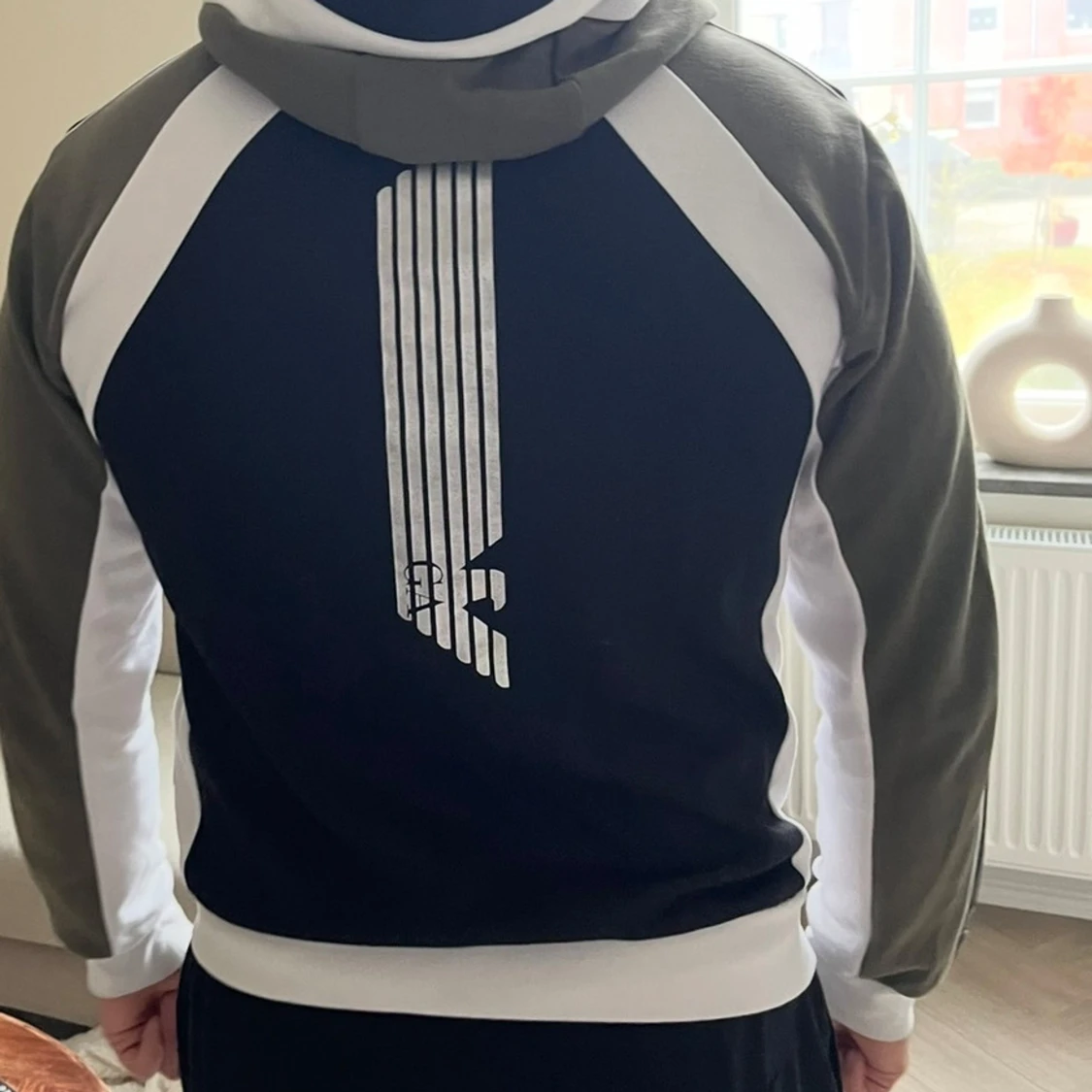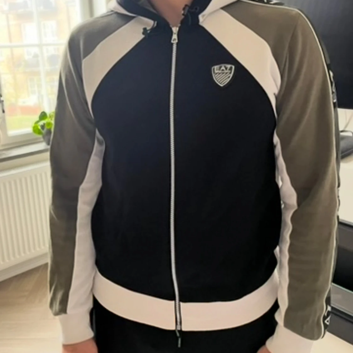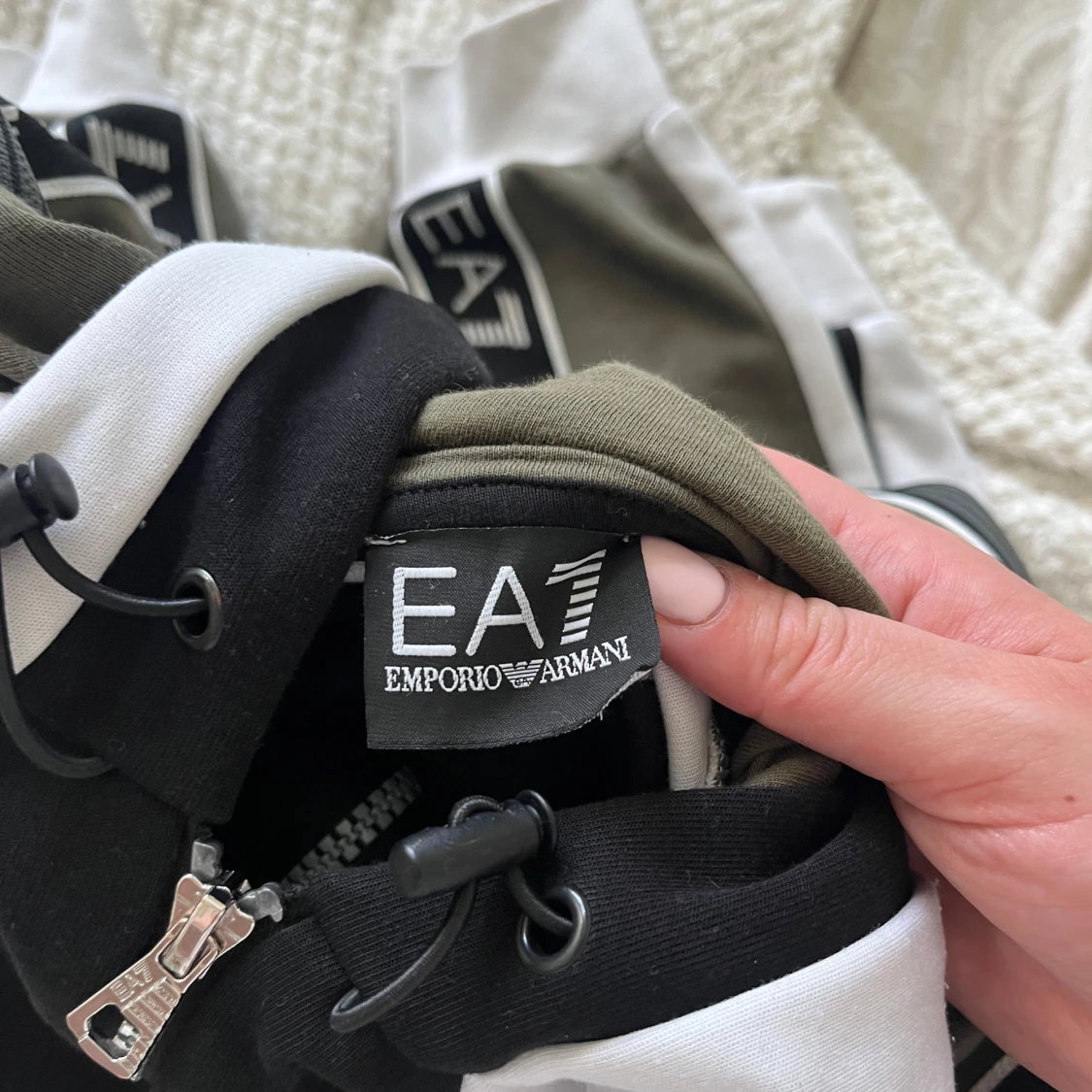 Snygg zip hoodie från EA7 Emporio Armani i svart, vitt och khaki. Jackan har huva med snörning, dragkedja framtill och coola EA7-loggor på bröstet, ärmen och ryggen.