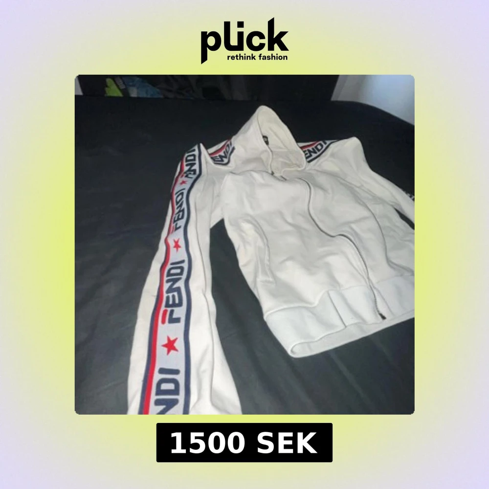 Säljer en snygg vit jacka från Fendi med dragkedja och ribbade muddar. Jackan har långa ärmar med Fendi-logga och röda stjärnor längs sidorna. På baksidan finns en stor Fendi Roma-brodering i blått och rött. Perfekt för dig som vill ha en stilren och exklusiv look. storleken är L, men sitter som M.