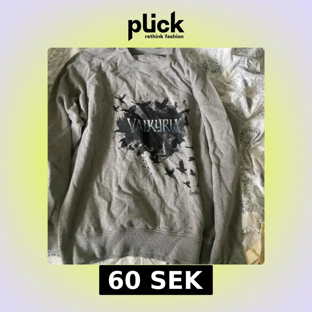 Säljer en grå sweatshirt från Liseberg med stort svart tryck och texten 'Valkyria' på bröstet. Tröjan har rund halsringning och långa ärmar. Perfekt för dig som gillar myskläder med coolt motiv.
