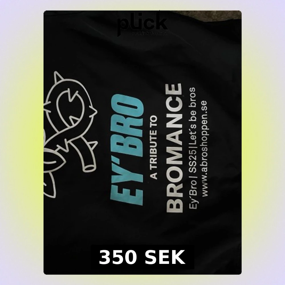 Svart hoodie från Ey'Bro med stort grafiskt tryck på ryggen i vitt och blått. Texten 'A tribute to bromance' och en stiliserad ros ger en unik vibe. Hoodien har ribbade muddar och klassisk huva. Perfekt för dig som vill sticka ut med streetwear.
