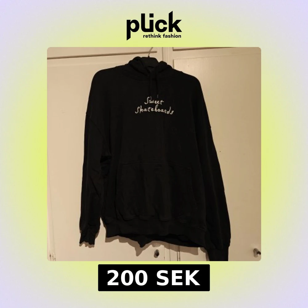 Svart oversized hoodie från Sweet Skateboards med vit broderad text på bröstet. Klassisk känguruficka framtill, huva med snörning och mjukt material. Perfekt för chill dagar eller skateparken.