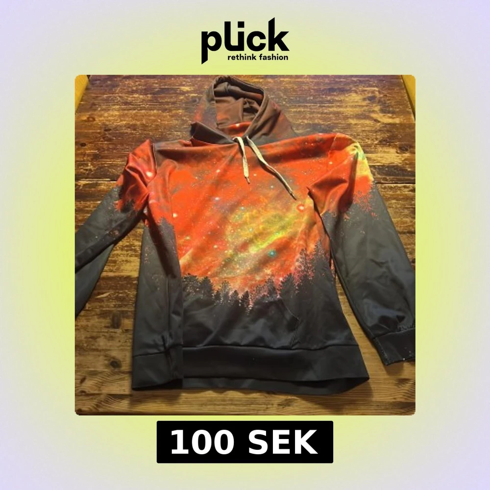 Säljer en unik hoodie med huva och snörning. Tröjan har ett färgstarkt galaxmönster i rött, gult och grönt. Långärmad och tillverkad i mjukt syntetmaterial. Perfekt för dig som gillar statement-plagg och coola tryck. Svinskön!