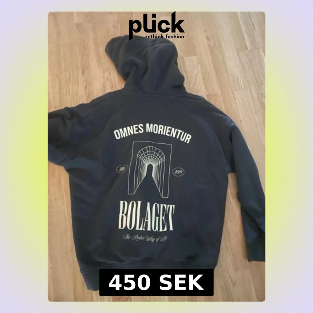 Svart hoodie med stor vit print på ryggen med texten 'OMNES MORIENTUR' och 'BOLAGET'. Snygg grafisk design och huva. Perfekt för dig som gillar streetwear och vill sticka ut med en unik look.
