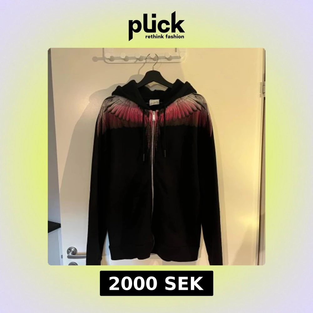 Svart hoodie från Marcelo Burlon med dragkedja och huva. Snyggt vingmönster i rött, grått och vitt över axlar och bröst. Långärmad modell med snörning i huvan och två fickor framtill. Perfekt statement-plagg för dig som vill sticka ut.