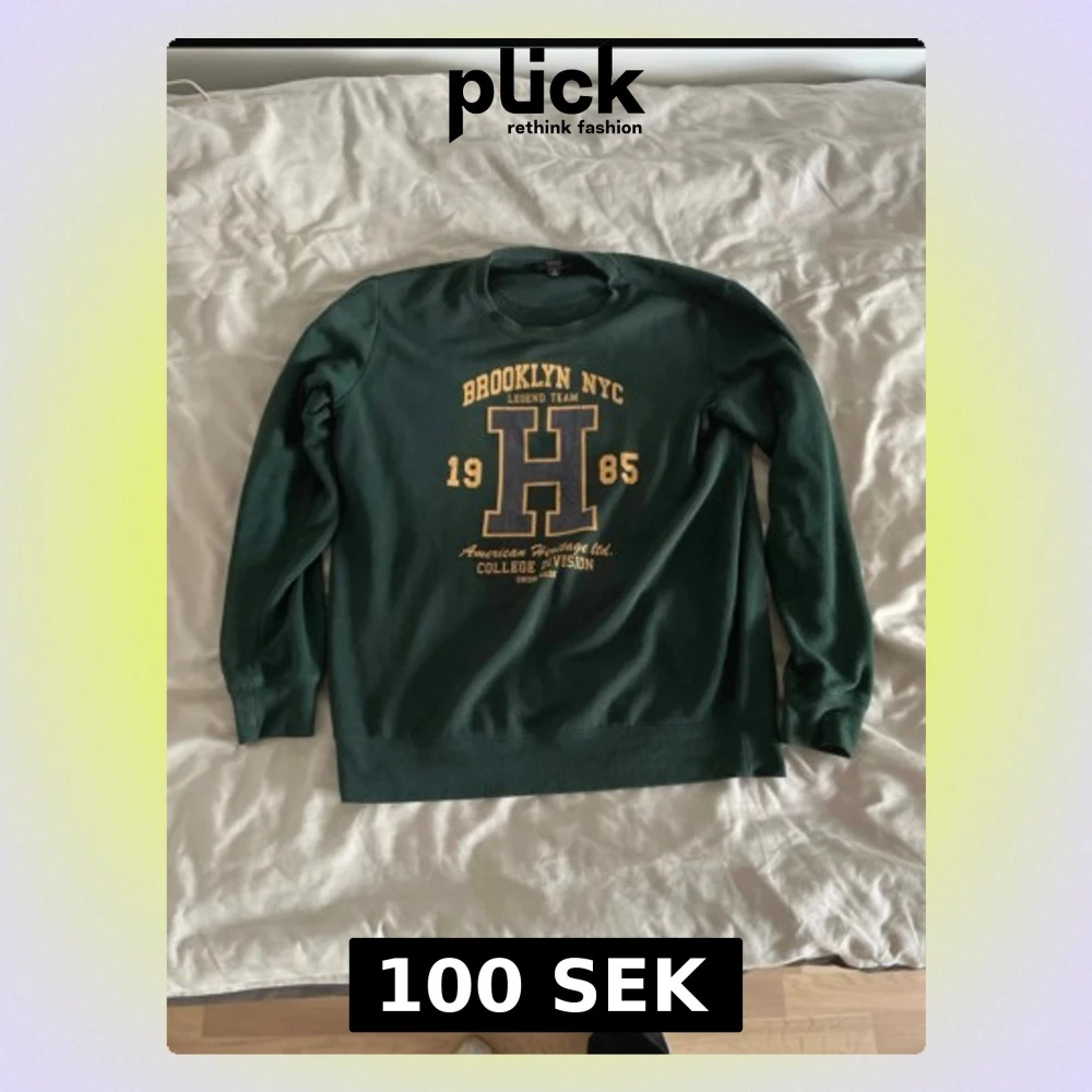 College-tröja i mörkgrönt med tryck i gult och blått framtill. Stor bokstav H och texten Brooklyn NYC 1985 ger en cool retro-vibe. Rund hals och långa ärmar, perfekt för chill dagar. Materialet är mjukt och känns som bomull.