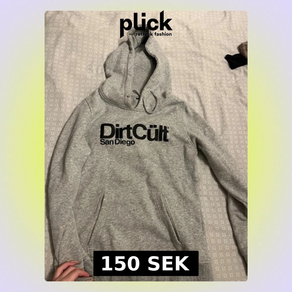 Snygg grå hoodie från Dirt Cult med svart tryck 'Dirt Cult San Diego' på bröstet. Skön och knappt använd så superfint skick! Inge fläckar eller skavanker, storlek L men sitter som en S då dessa hoodies är väldigt små i storleken☺️